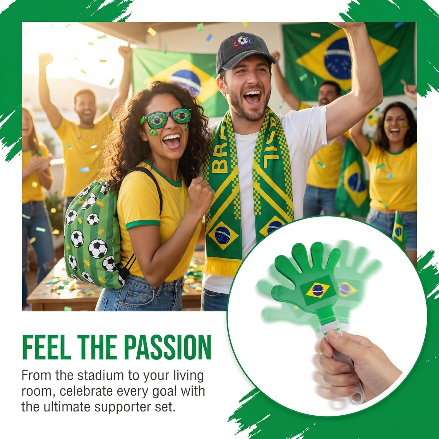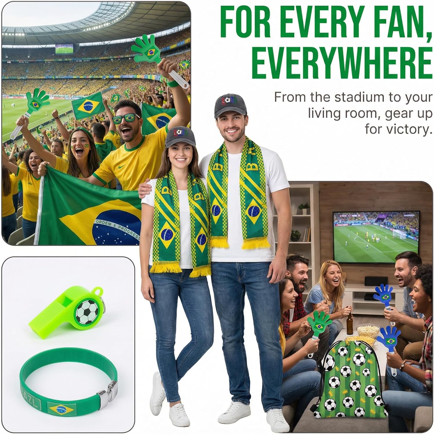 Ultimate Fan Gear Set – Complete Brazilian Patriotic Pack This all-in-one fan gear set has everything you need to showcase your Brazilian pride at the World Cup or any soccer event. It includes a durable Brazilian flag (34.65 in × 23.23 in), a soft and stylish flag scarf (52.76 in × 6 in), non-toxic face paint, retro flag-themed sunglasses, a sleek wristband, a cheer clapper, a whistle, two inflatable cheer sticks, a comfortable hat, and a convenient drawstring backpack. Made from Durable, Comfortable Materials Each item is crafted with high-quality materials built to last. The flag is made from weather-resistant polyester, while the scarf features a soft, breathable fabric for all-day comfort. The sunglasses are constructed from durable plastic with UV protection, making them ideal for outdoor game days. Designed to Fit Fans of All Ages The flag measures 34.65 by 23.23 inches, perfect for waving in the stands or displaying at tailgate gatherings. The scarf is 52.76 by 6 inches—just the right length to wrap comfortably around the neck. The compact clappers and wristbands are designed to suit fans of any age. Ideal for Patriotic Occasions In addition to the World Cup, this set is perfect for birthday celebrations, Carnival festivities, and other patriotic events. Its classic design ensures you'll stand out and proudly display your national spirit wherever you go.