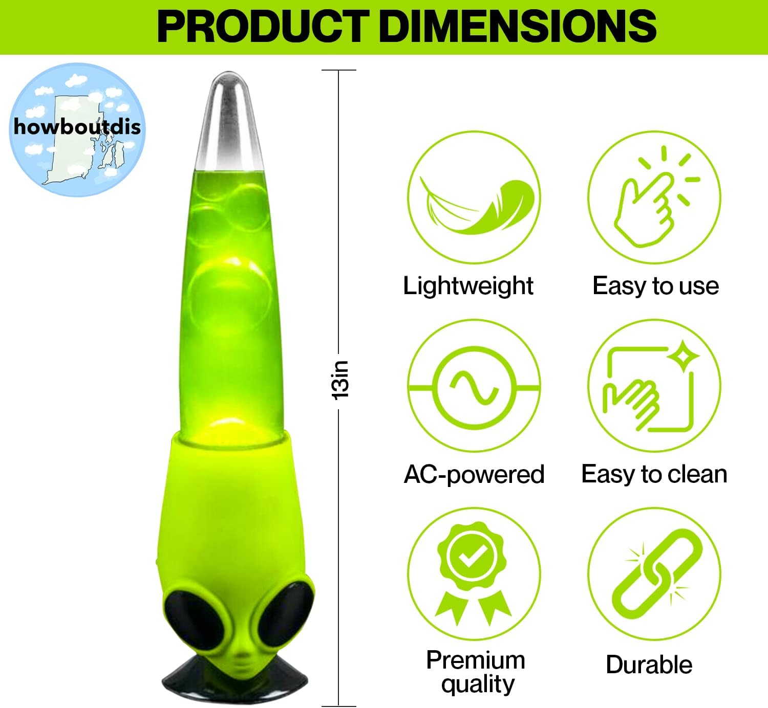 You will receive (1) 13" Alien head wax motion lava lamp. This item is electronic and should not be used near any wet areas, for indoor use only. It is perfect for jazzing up your desk, dorm room or bedroom. It is definitely a mood enhancer as the floating wax bubbles can be quite mesmerizing. Please use caution when enjoying this product. Not for children under 12.