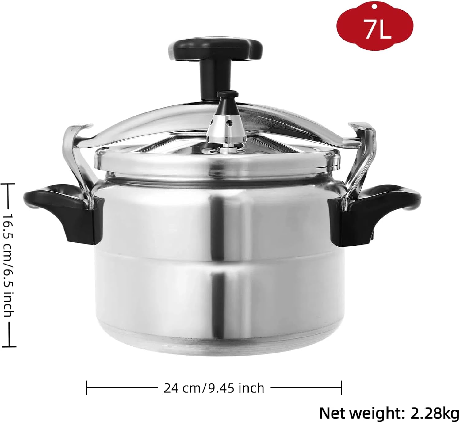 **Description** Elevate your culinary experience with our premium pressure cooker, designed for both seasoned chefs and cooking enthusiasts. Made from safe, high-quality materials, it meets diverse cooking needs, including steaming, boiling, and more. **Key Features:** - **Generous Capacity:** Perfect for family meals, our pressure cooker offers ample space to prepare delicious dishes in one go, making it an essential kitchen companion. - **Easy to Clean:** The smooth design and wide opening allow for hassle-free cleaning. Just a quick wipe with a damp cloth is all it takes to keep it spotless. - **Thoughtful Gift Idea:** Practical and versatile, this pressure cooker makes for a thoughtful gift for holidays, housewarming parties, or for any friend who loves to cook. **Safety and Design:** - **Rounded Edges:** The smooth, burr-free edges enhance user comfort and safety, making cooking a more enjoyable experience. - **Silicone Seal:** This feature minimizes steam loss while ensuring better heat retention for perfectly cooked meals every time. **Versatile Application:** Ideal for use in home kitchens, restaurants, and hotels, our pressure cooker is suitable for preserving fruits, making soups, stewing meats and vegetables, and cooking rice. It works seamlessly on gas stoves and electric ceramic cooktops. **Specifications:** - **Material:** Durable aluminum alloy and silicone - **Color:** Sleek silver - **Size Options:** Available in various capacities from 3.17 to 15.85 quarts, each designed to accommodate different cooking needs. **Package Includes:** - 1 Pressure Cooker - 1 English Manual **Usage Notes:** 1. For first-time use, clean the pot with water and detergent, then heat for 30 minutes to remove impurities. 2. Ensure the pressure limiting valve and relief port are clean before each use. 3. Always monitor venting times and do not leave the cooker unattended. 4. Avoid boiling an empty pot and hand wash only—dishwasher cleaning is not recomm...