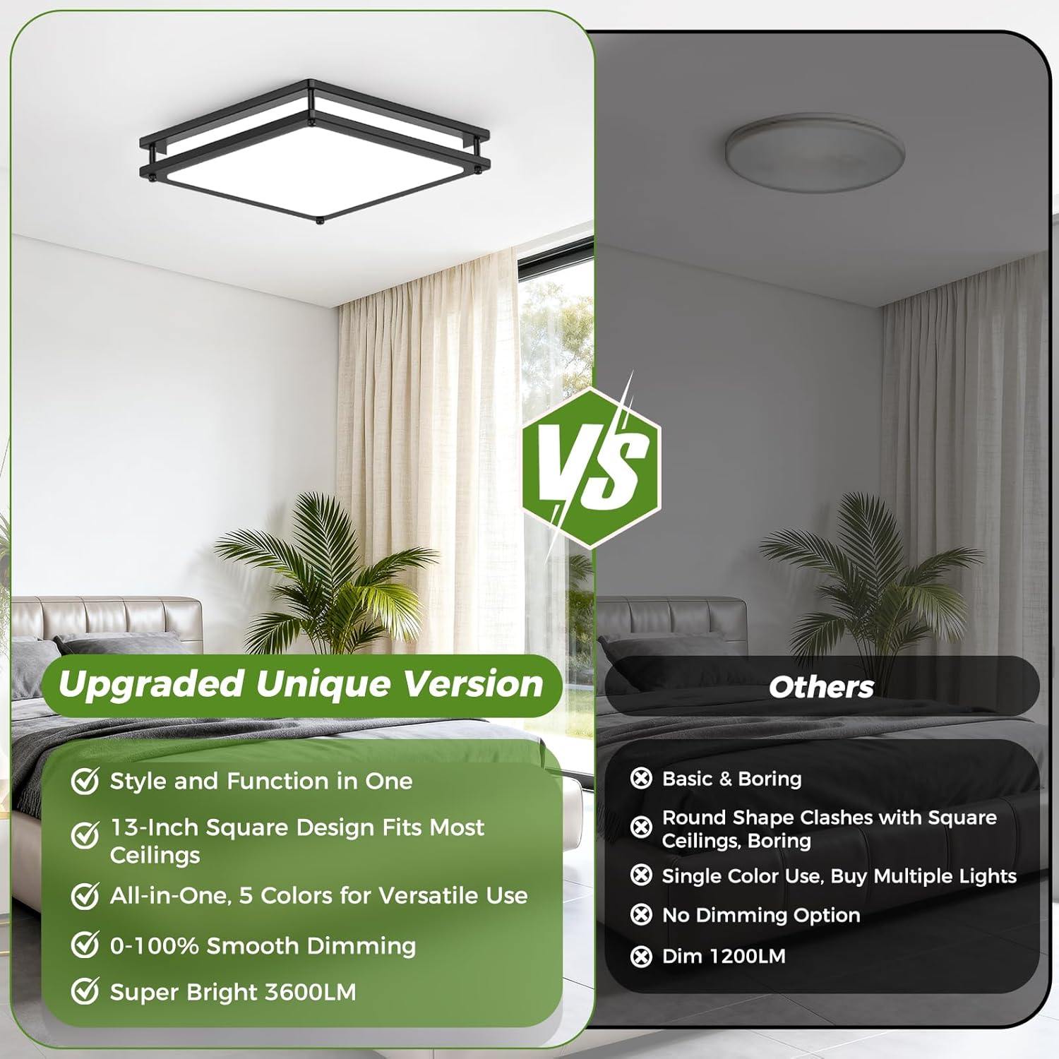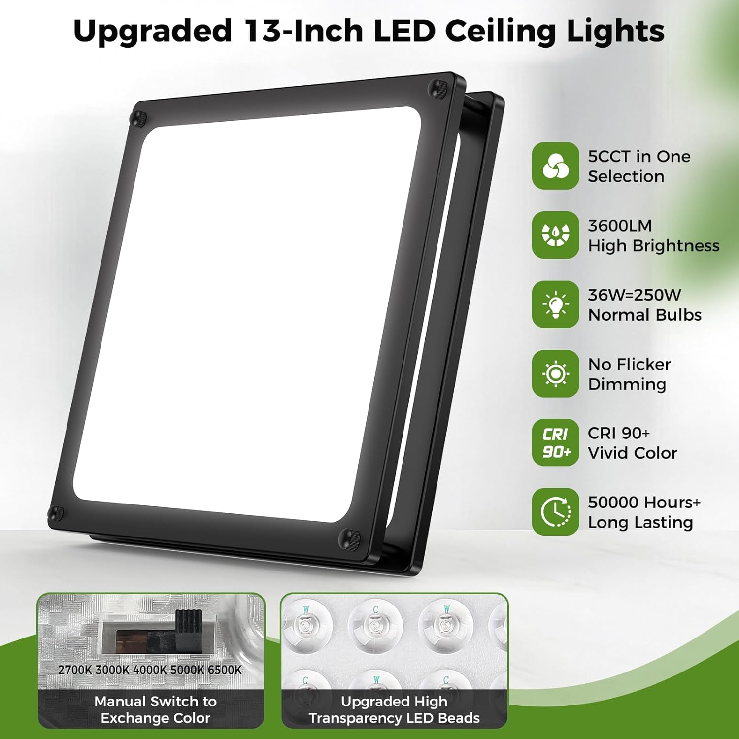 | Other Special Features of the Product | 13Inch Unique Square Design, 0-100% Stepless Dimmable, 5 Color Temperature, 3600LM Super Bright, Easier Installation |