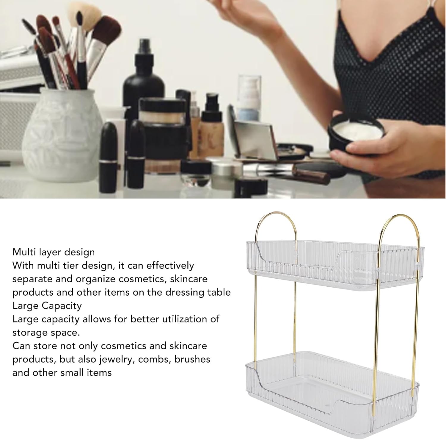 1. MULTI TIER DESIGN: The countertop organizer has a multi tier design that effectively separates and organizes makeup and skin care products as well as other items on the dressing table. 2. LARGE CAPACITY: The large capacity design of the 2 tier makeup shelf organizer makes it possible to make fuller use of the storage space, not only for cosmetics and skincare products, but also for jewelry, combs, brushes and other small items. 3. SIMPLE APPEARANCE: The double layer makeup stand adopts a simple and fashionable design style, which can be matched with various dressing table Enhance the overall beauty of the dressing table. 4. TIDY STORAGE: 2 tier makeup shelf organizer tidy storage, goodbye to messy, save countertop space, washstand become neat. 5. FINE WORKMANSHIP: Double layer makeup stand has fine workmanship, slick edges, no blemishes, no scratches on hands; thickened metal, colorfast, and long lasting. Spec: Item Type: Double Layer Makeup Stand Material: Iron, PP Weight: Approx. 844g/29.8oz Bottom Organizer Size: Approx. 30x17x6cm / 11.8x6.7x2.4in Total Height: Approx. 33cm/13.0in Height Between Two Layers: Approx. 21.5cm/8.5in packing list: 2 x Organizer 4 x Support Bar 2 x Handle Note: Manual measurement please allow some error.