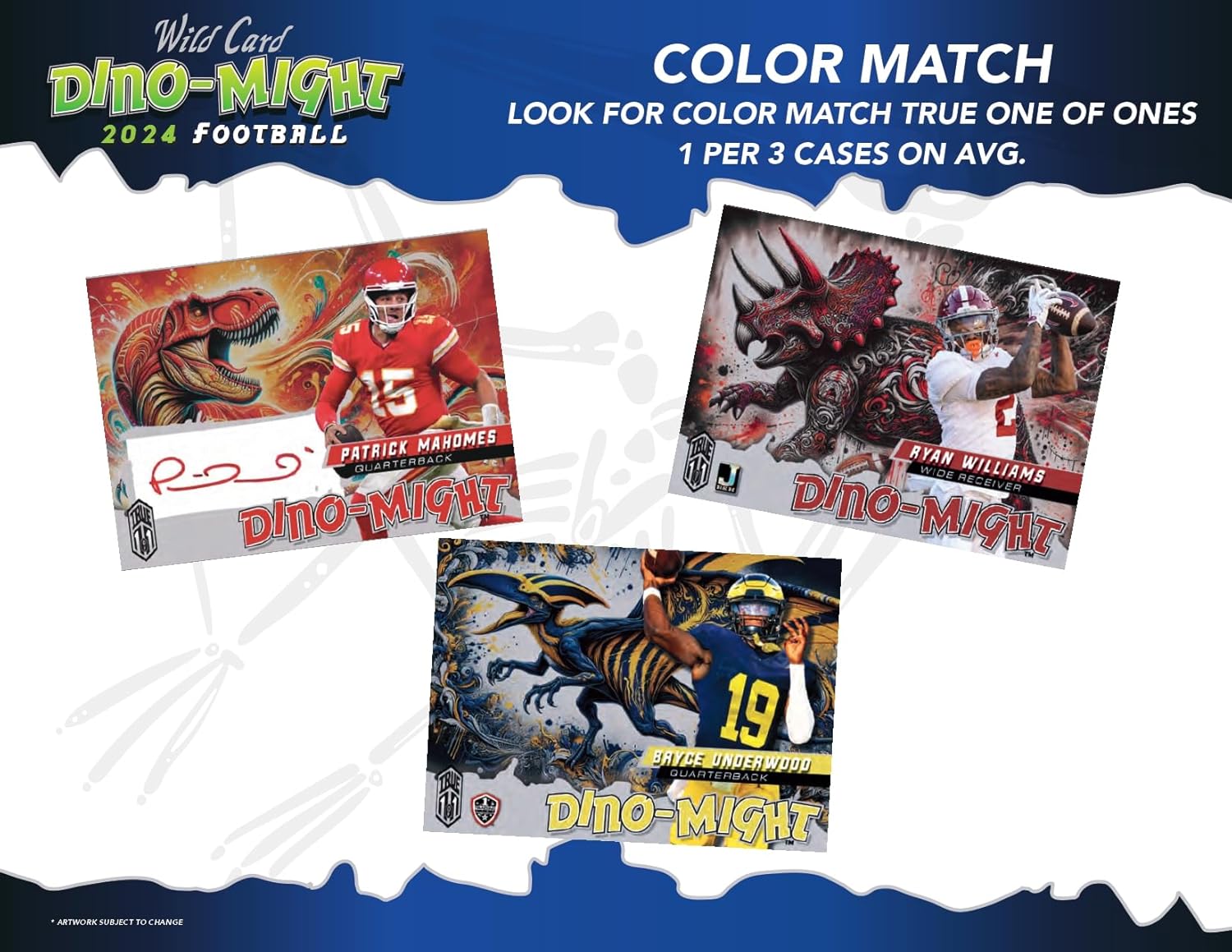 The 2024 Wild Card Alumination Dino-Might Football Hobby Box features vibrant designs, exclusive autographs, and limited-edition parallels. A must-have for any football card collector. PRODUCT DESCRIPTIONChecklist:- Ashton Jeanty- Avery Johnson- Ben Roethlisberger- Bo Jackson- Bryce Underwood- Bucky Irving- Caleb Williams- Cam Skattebo- Cameron Ward- Carson Beck- Dan Marino- Dillon Gabriel- DJ Lagway- Drake Maye- Drew Allar- Drew Brees- Eli Manning- Garrett Nussmeier- Isaiah Bond- J.J McCarthy- Jalen Hurts- Jalen Milroe- Jared Goff- Jaxson Dart- Jerome Bettis- Jordan Love- Josh Allen- Julian Lewis- Keon Coleman- Ladd McConkey- LaNorris Sellers- Luther Burden III- Nick Nash- Nico Iamaleava- Patrick Mahomes- Peyton Manning- Ricky Pearsall- Ryan Williams- Sam Leavitt- Shedeur Sanders- Steve Young- Tetairoa McMillan- Travis Hunter- Tyler Warren- Will Howard- Xavier LegetteDual Auto Checklist:Ashton Jeanty + Travis HunterBrett Favre + Dan MarinoBryce Underwood + Julian LewisCaleb Williams + Drake MayeCaleb Williams + J.J McCarthyCarson Beck + Nico IamaleavaCarson Beck + Jalen MilroeCarson Beck + Jaxson DartDJ Lagway + Garrett NussmeierDJ Lagway + LaNorris SellersDJ Lagway + Nico IamaleavaLadd McConkey + Keon ColemanLuther Burden III + Isaiah BondLuther Burden III + Ryan WilliamsPatrick Mahomes + Josh AllenPeyton Manning + Dan MarinoPeyton Manning + Drew BreesPeyton Manning + Eli ManningShedeur Sanders + Cameron WardShedeur Sanders + Jalen MilroeTetairoa McMillan + Isaiah BondTetairoa McMillan + Nick NashTetairoa McMillan + Travis HunterTravis Hunter + Cameron WardTravis Hunter + Nick NashWill Howard + Nico IamaleavaWill Howard + Dillon GabrielWill Howard + Drew Allar