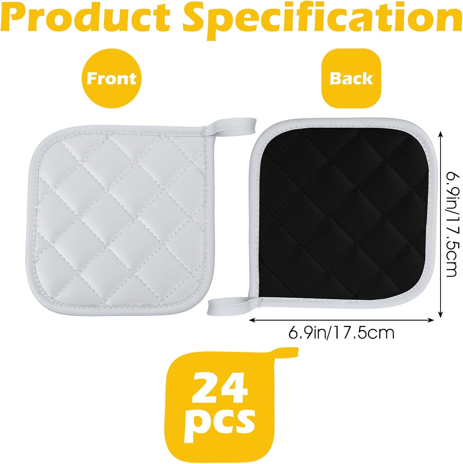 Wide Application: Pot mats have a non-slip texture on the surface to hold on to hot dishes or pans. You can use it in a variety of occasions with ease, such as family gatherings, restaurants, dormitories, bars, bakeries, restaurants, cafes, hotel banquets, etc.Practical Design: Equipped with a hanging loop, this square pot mat can be hung to dry after washing, and it can also be used as a kitchen hand cloth, absorb water, oil, wear-resistant, and can be folded for use, multifunctional pot mat to improve your cooking experience.Specifications:Material: CottonColor: BlackSize:about 7 x 7 InchPackage includes:24 x Pot HoldersNotes:Manual measurement, please allow slight errors on size.The color may exist a slight difference due to different screen displays.