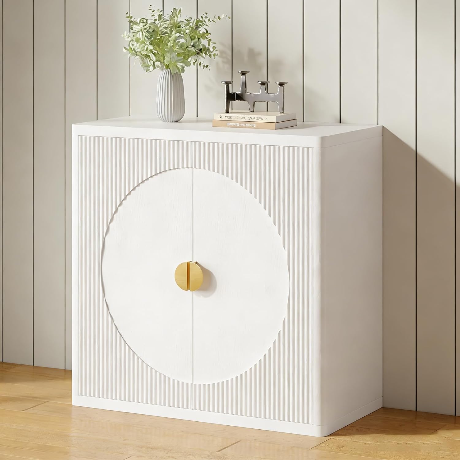 Product features: This sideboard is made of MDF, boasting a sturdy structure and excellent load-bearing capacity—the top can support 75 pounds, and each shelf 35 pounds. The interior features three adjustable shelves for flexible and convenient storage. Its exterior incorporates a symmetrical circular and grooved design, complemented by soft-close doors and round metal handles, combining aesthetics and practicality. The thick base with plastic feet and an anti-tipping device ensures stability. Suitable for various settings including dining rooms, kitchens, and living rooms. Assembly is required, but all accessories are included, making installation simple and convenient. Specifications: Product size:31.5"L x 15.6"W x 31.5"H net weight:57 lbs Materials: MDF Color:Walnut, light oak, and white Style: As shown in the picture Note: Dimensions may vary slightly due to manual measurement. Colors may vary slightly due to screen variations.