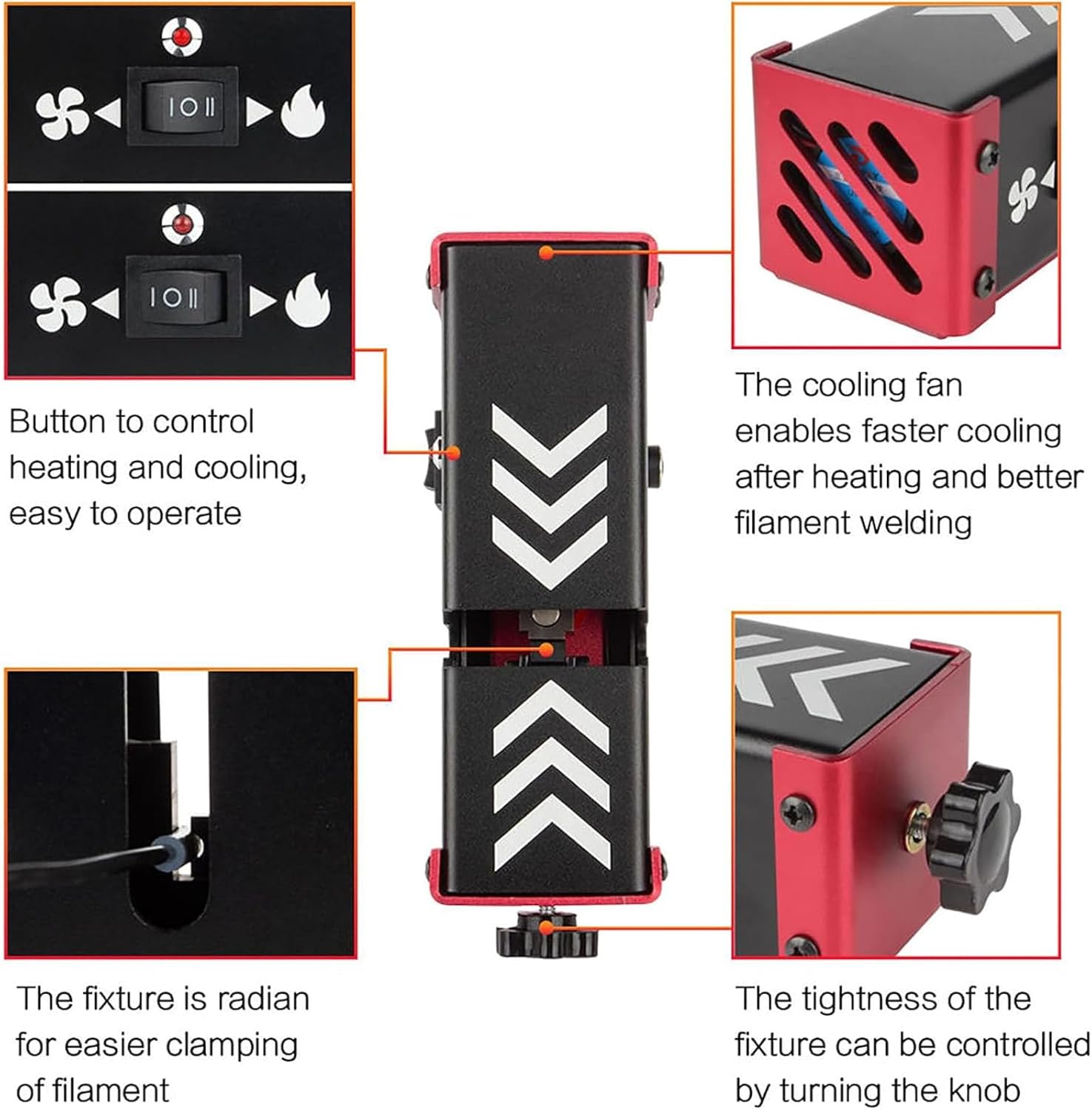 Features Universal Filament Compatibility: Works with all 1.75mm 3D printing filaments, making it ideal for standard DIY projects. Creative Multi-Color Printing: Connect filaments of the same material but different colors to bring your custom 3D printing ideas to life. Specifications Product Name: Filament Welder Power Input: 100-240V AC Power Output: 12V 4A, 48W Filament Diameter: 1.75mm Compatible Filament Types: PLA, ABS, PETG, PA, PC, and others Packaging Weight: 0.56kg Packaging Dimensions: 23 x 18 x 7 cm Package Includes Filament Welder × 1 Power Adapter × 1 Filament Peeler × 1 Peeler Tool × 1