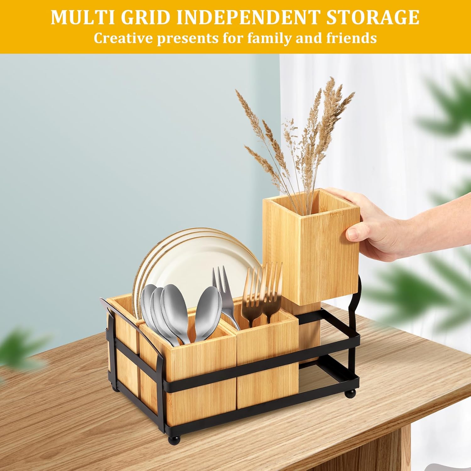 Detailed description:Description :This countertop silverware caddy is crafted from bamboo and iron. It serves as an ideal solution to neatly arrange your tableware. Beyond organizing tableware, this caddy is suitable for storing scissors, makeup brushes and markers, making it a practical addition to not just kitchens, but also bathrooms, offices or craft areas where organized storage is a mustSpecification:Product Name: Plate Silverware CaddyComposition: Bamboo, IronColor: SuntanSize: 26.5x18x12.5cm/10.43x7.09x4.92 inchLarge Compartment: 26x8cm/10.24x3.15 inchSmall Compartment: 8.5x8.5cm/3.35x3.35 inchKey Feature :4 Compartments: The caddy features 4 separated sections, which are specifically designed to efficiently categorize dishes, knives, forks and spoons. This design allows you to grab the items you need without searchingCompartmentalized Storage: The interior features a multi section design with separate compartments. Organize your cutlery by type for easy access, no more rummaging through drawers to find a single pieceMulti Functional: This organizer isn't just for cutlery, it's suitable for any kitchen utensils. It also works great in offices or living rooms for storing remotes, pens, chargers and moreWide Application: The utensil holder for party is ideal for everyday dining, BBQ,camping, parties, picnics, buffets.The classic design makes it fit for wedding, engagement, birthdays, anniversary, business events, also for restaurants, hotels and cafesParts List:1 x Bamboo Plate Silverware CaddyNote: 1.There may be slight differences between the picture and the actual color of the commodity. We will try our best to show you the exact color. 2.Please allow slight dimension difference due to manual measurement.