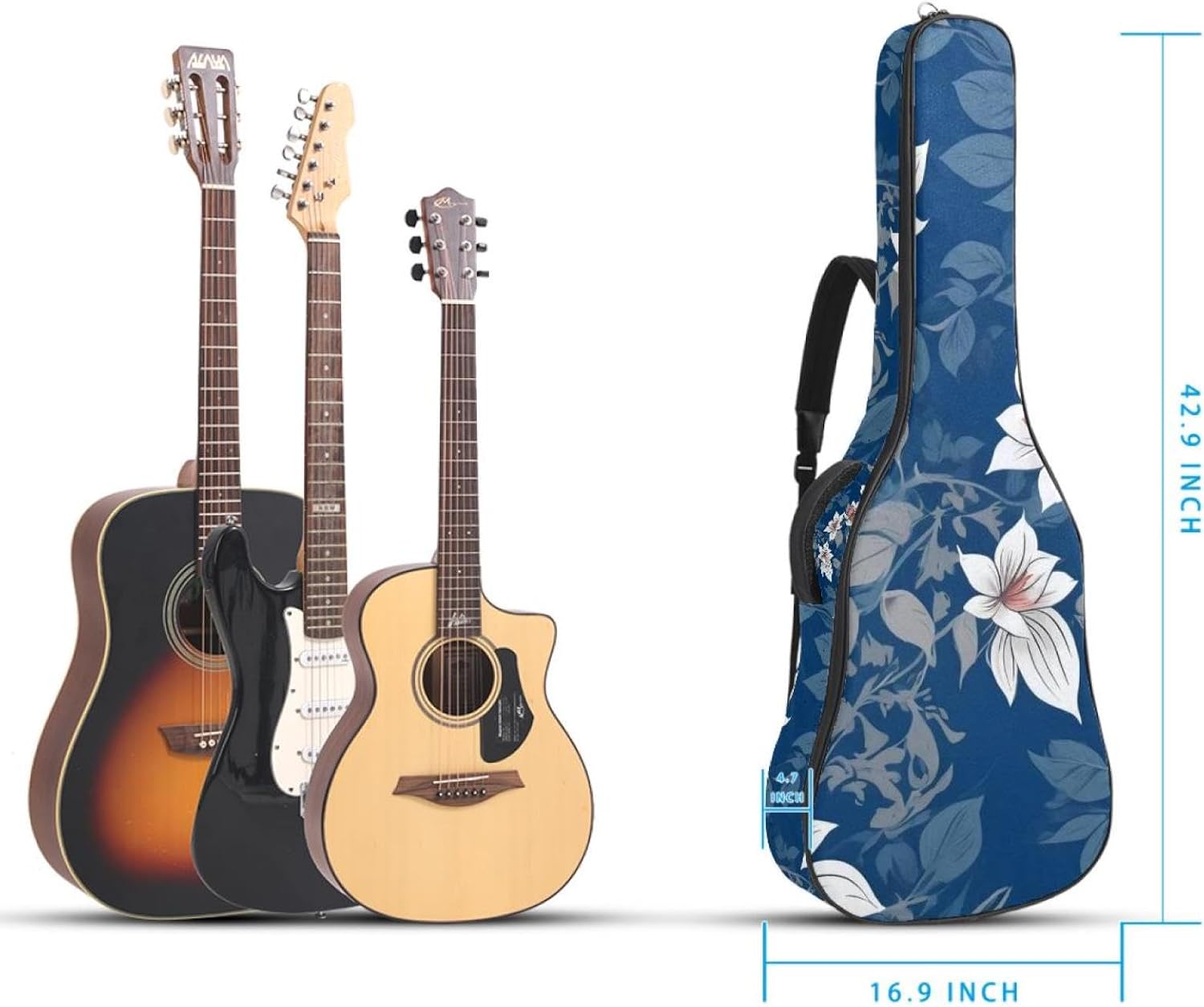 This versatile guitar gig bag is the perfect accessory for any musician needing reliable protection and easy portability for their instrument.With dimensions of 42.9x16.9x4.7 inches, this gig bag accommodates a wide range of guitars, including electric, bass, acoustic, and classical. The waterproof Oxford fabric construction ensures your guitar remains protected from the elements, while the heavy-duty rubber base shields it from everyday knocks and bumps.Inside, the bag features a generously padded design with adjustable neck support to secure your guitar during transit. The smooth lining and anti-scratch fabric offer additional peace of mind, knowing your guitar is safe from scratches and damage. Practical storage solutions include two spacious pockets for neatly organizing essential guitar accessories, ensuring quick access when needed.Whether you're heading to a gig, a rehearsal, or simply storing your instrument, this guitar case offers a practical and reliable solution for musicians of all ages and skill levels.