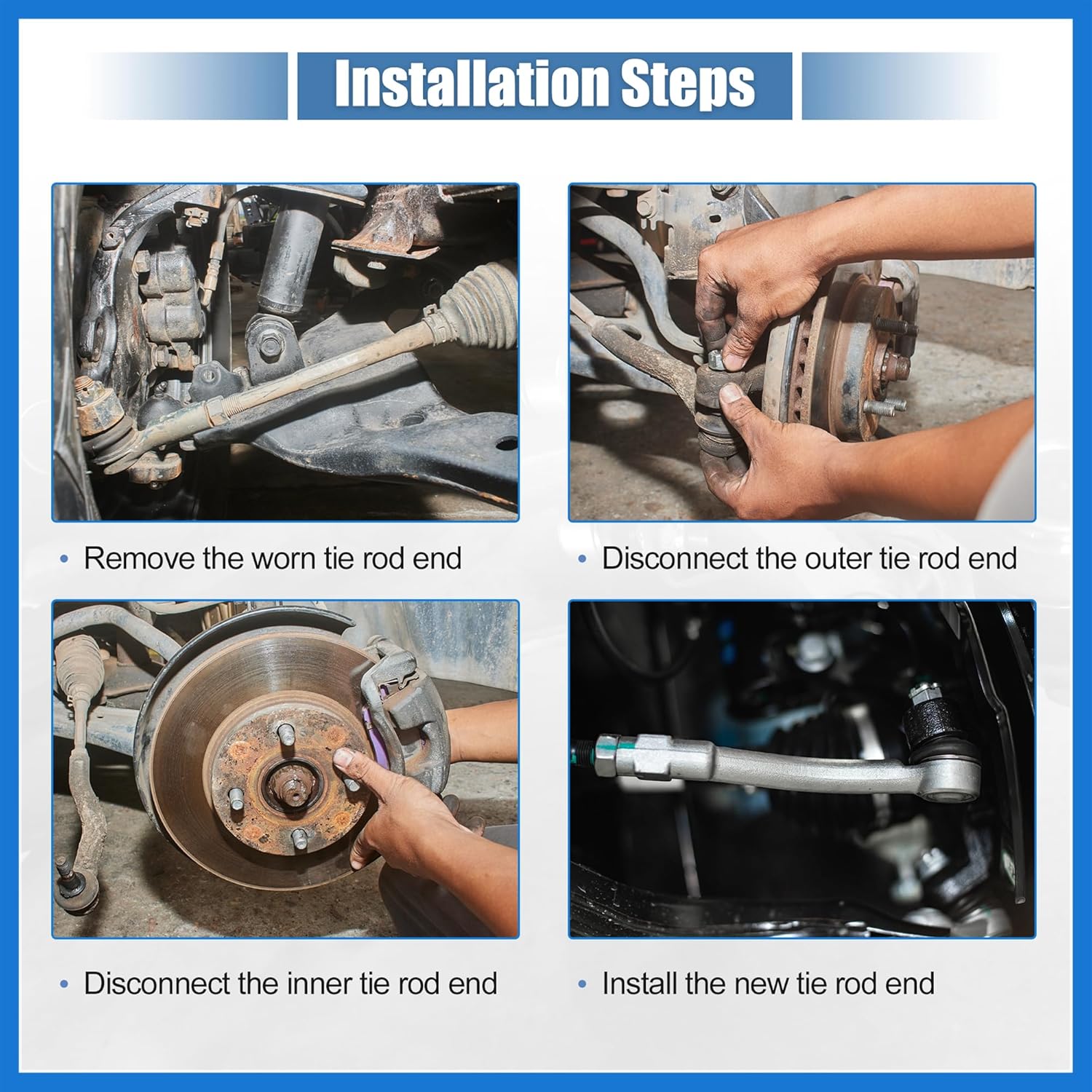 • Handy: INSTALLATION: Manual not included, you can loosen the pinch nut and remove the cotter pin, remove the castle nut and the outer tie rod end, then remove the boot and remove the inner tie rod end. At last, replace a new tie rod and install it back according to the method of disassembly.