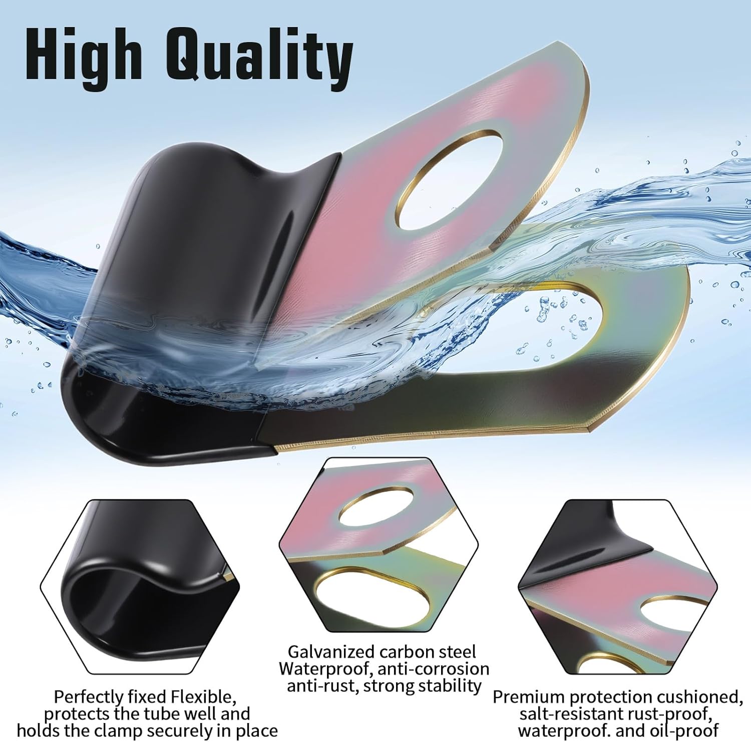 Feature: The cable clamp can be applied in different occasions, suitable for automotive, industrial, marine and household fields, bringing you a smooth and comfortable use experience. The R-shaped design makes the stainless steel cable clamp flexible and easy to twist, bend, operate, install and remove, saving your time and energy.Specifications:Product name: 50pcs black cable clampsFace color: blackMaterial quality: Carbon steel, rubberSize: width 3×1.6×1.1cm/1.2×0.6×0.4in, hole diameter 0.65cm/0.26inWeight: 202gPackaging clarity: 50pcs black black cable clampsWarm notes:Please allow slight errors in size due to manual measurement.