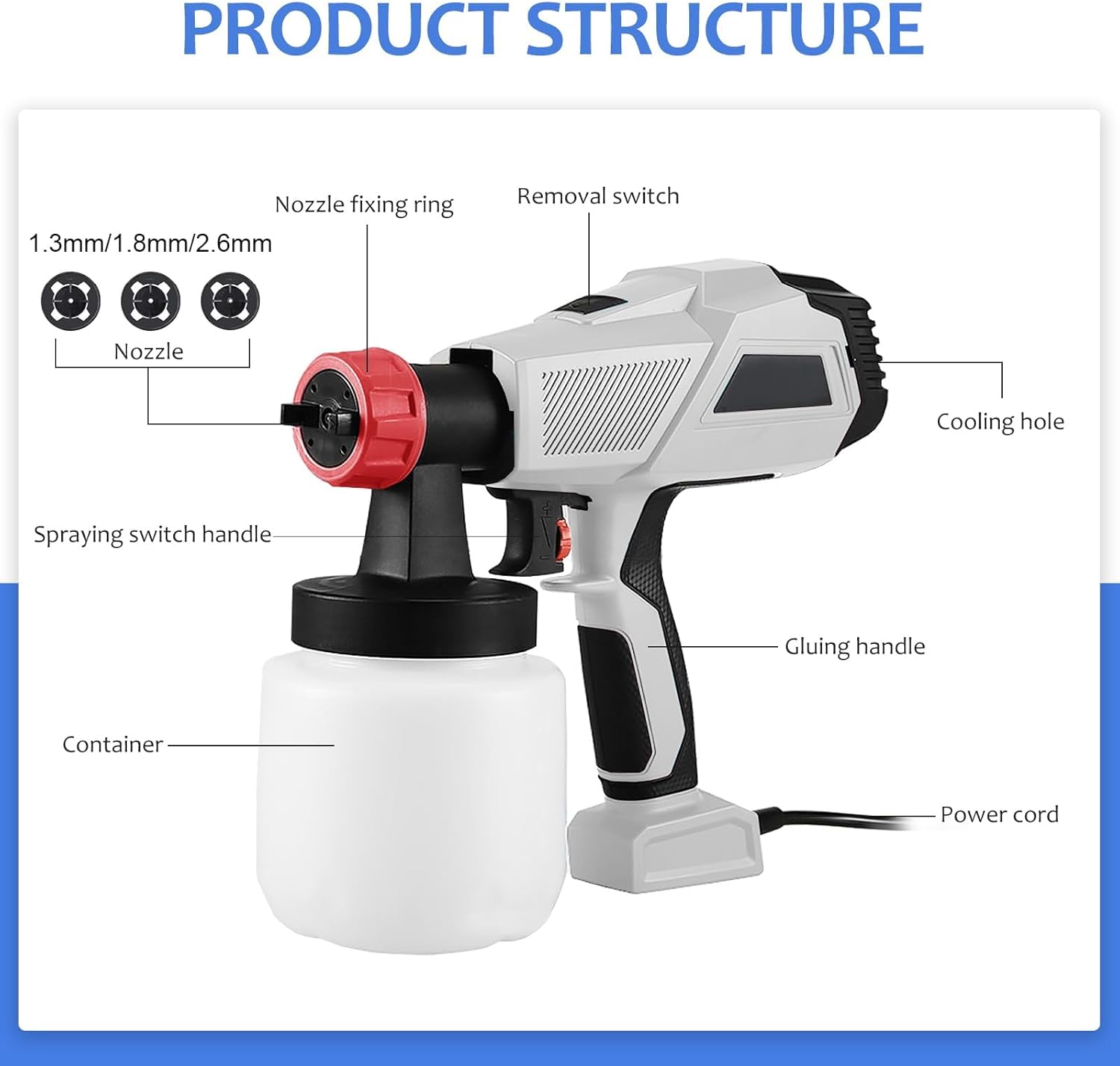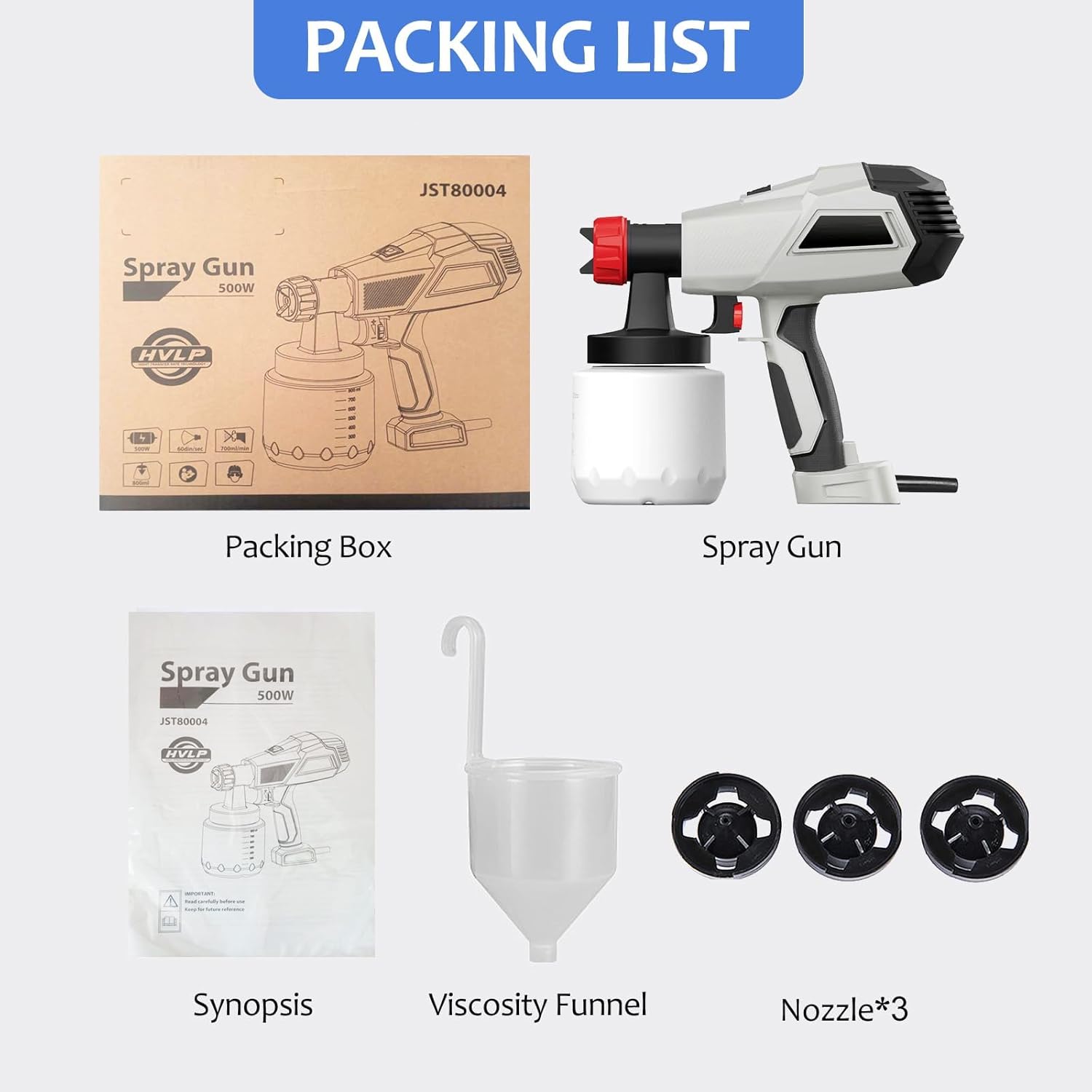 | Included Components | 1 x Electric Spray Gun(with Plug), 1 x Paint Funnel, 1 x Mouth Needle, 2 x Spring, 1 x Injector, 1 x Black Spin Tools, 1 x Instructions |