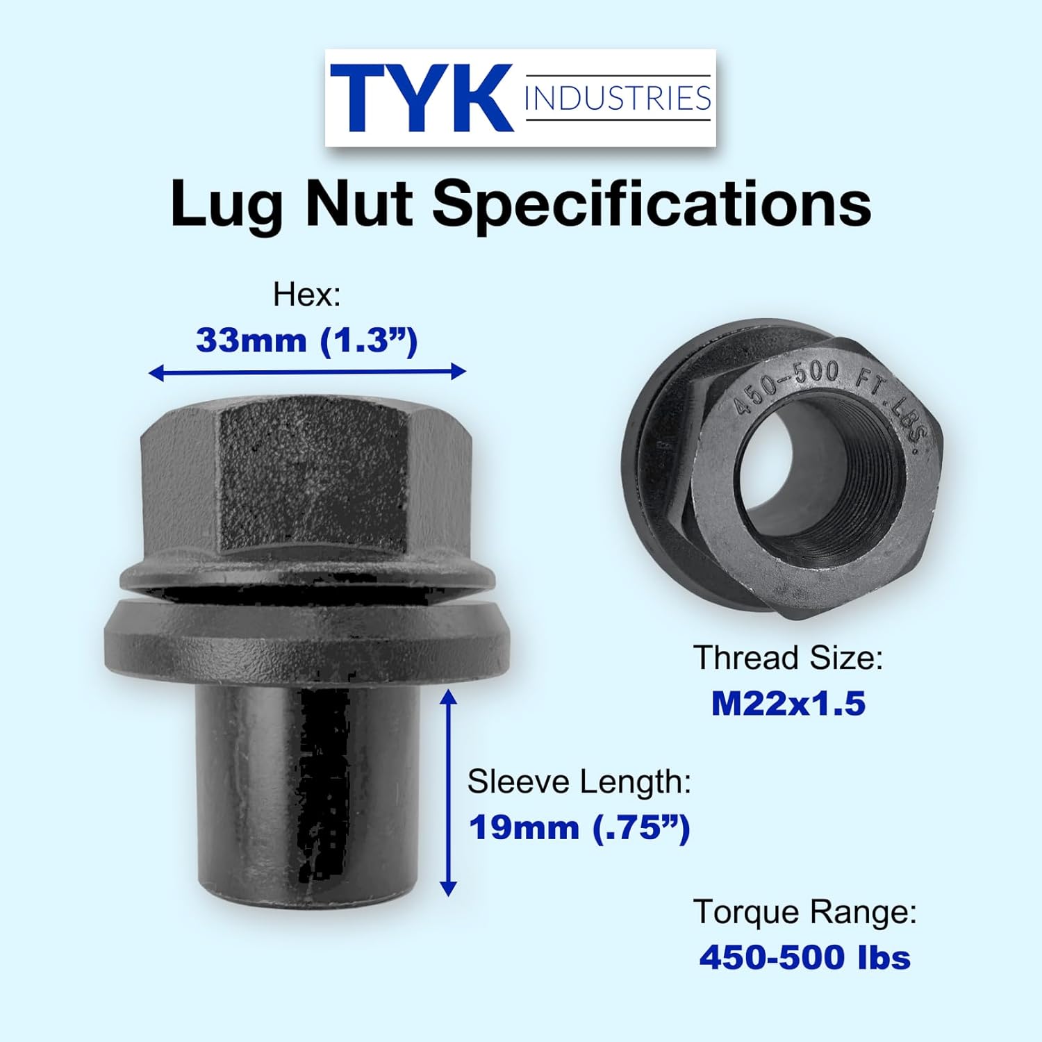TYK Industries' TYKGL-2919 is an M22-1.5 two piece flange wheel nut with a 19mm sleeve and a 33mm hex for uni-mount hub pilot 10 hole wheel systems found on semi trucks. Skirt nuts prevent rims from clocking (shifting forward or backwards) by filling the extra space between the stud and stud hole. This helps to improve vehicle stopping power, reduces vibration and increases the life of the wheel. This 19mm sleeve nut is designed for use on heavy duty aluminum wheels in the steer position, aluminum Super Single Wide Base wheels in the steer or drive position and aluminum outer, steel inner dual wheel applications in the drive position.