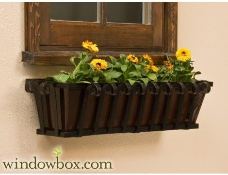 These Venetian Decora Window Boxes feature Galvanized Metal Liners that are powder coated Bronze and are available in seven different sizes. These new Bronze Galvanized Metal liners are extremely rust resistant and provide more planting depth then the garden center style liners. Finished with a beautiful rolled top trim and holes for drainage these Galvanized Liners are a perfect complement to the Venetian iron work design . Installing Venetian Decora Window Boxes overflowing with your favorite flowers will add charm, elegance and a touch of your personal style to any home. Bolts sold separately and not included. Your hardware will vary depending on the surface you are mounting your window box planter to.
