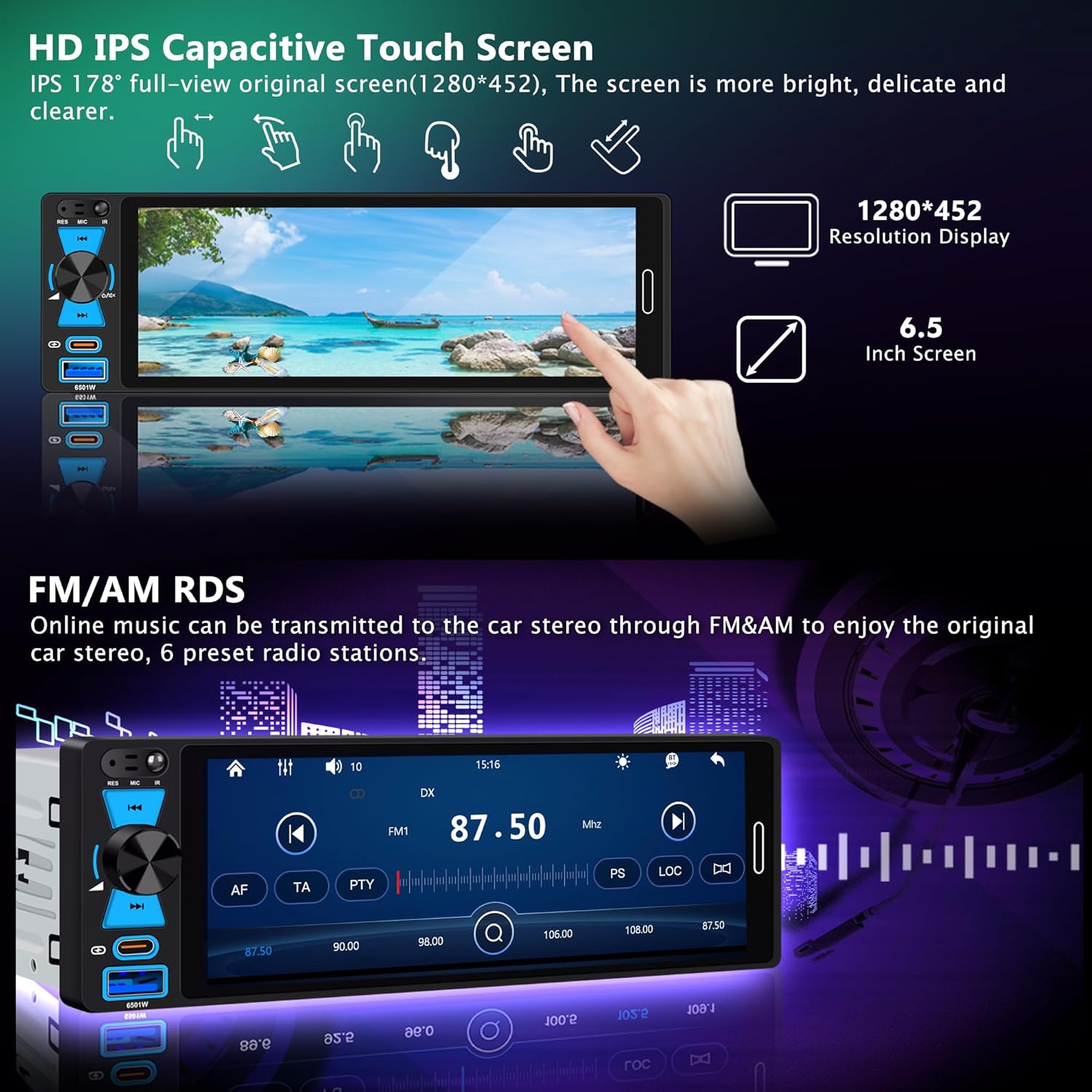 | Other Special Features of the Product | 6.5" HD IPS 1280×452 Touchscreen, USB/Type-C, Mirror Link, Bluetooth 5.2, FM, AM , EQ, SWC, Backup Camera, Android Auto, Apple CarPlay, Built-In Bluetooth, Rear View Camera Input |