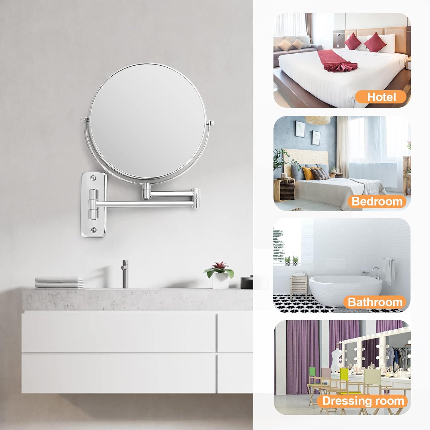 | Additional Features | 360° Smooth Swivel Rotation, Dual-Sided Precision Viewing, Extendable & Space-Saving Arm, Premium Chrome & HD Glass Build, Stable Wall-Mounted Design |