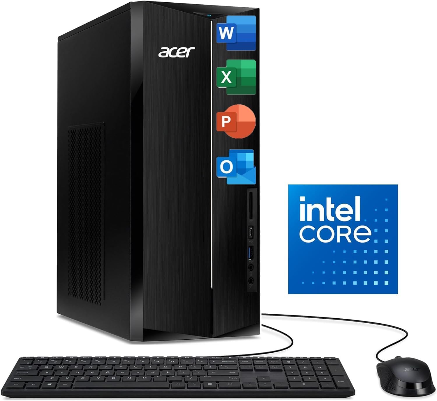 General Brand: Acer Color: Black Computer Type: Tower Operating System: Windows 11 Processor Processor Manufacturer: Intel Processor Model: Core i5-14400 Processor Cores: 10-Core Processor Generation: 14th Generation Memory 8GB DDR5 4800 MHz Storage 512GB PCIe M.2 2280 Gen 4 + 1TB HDD Graphics GPU: Intel UHD Graphics 730 Graphic Type: Integrated Graphics Network & Communications Wireless Networking: Wi-Fi 6E (2x2/160) Gig+ Bluetooth: Bluetooth 5.3 Ethernet: 10/100/1000 Gigabit Ethernet LAN Audio Audio System: High-Definition Audio Audio Support: 5.1-Channel Surround Sound Audio Ports: 5 Ports Ports & Slots USB 2.0 Ports: 4 USB 3.2 Gen 1 Type-C Port: 1 USB 3.2 Gen 1 Type-A Ports: 2 HDMI 1.4b Port: 1 HDMI 2.0 Port: 1 RJ-45 Ethernet Port: 1 Keyboard & Mouse Included Keyboard: USB Wired Keyboard Included Mouse: Wired Optical Mouse Power Supply Power Supply Wattage: 300 W Power Supply Efficiency: 80 Plus Bronze Physical Characteristics Dimensions (Width x Depth x Height): 6.42 x 13.78 x 13.39 inches Additional Features Features: Bluetooth, Keyboard and Mouse Included Ideal for Home Office, Students, and Everyday Computing Fast SSD and DDR5 Memory for Quick Performance Modern Connectivity with Wi-Fi 6E and Multiple Ports