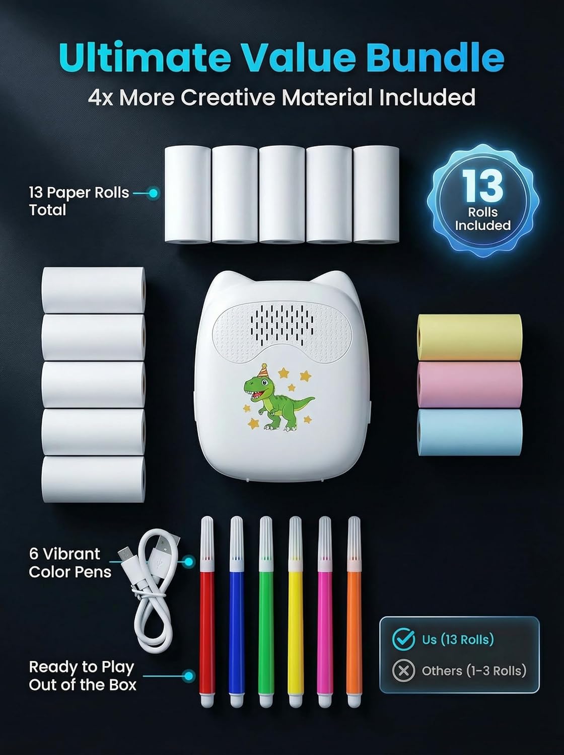 | BuiltIn Media | 1 Ai Voice-activated Sticker Printer, 3 Rolls Colored Paper, 5 Rolls Adhesive Paper, 5 Rolls Instant Photo Paper, 6 Colored Pens, Usb Charging Cable, Instruction Manual |