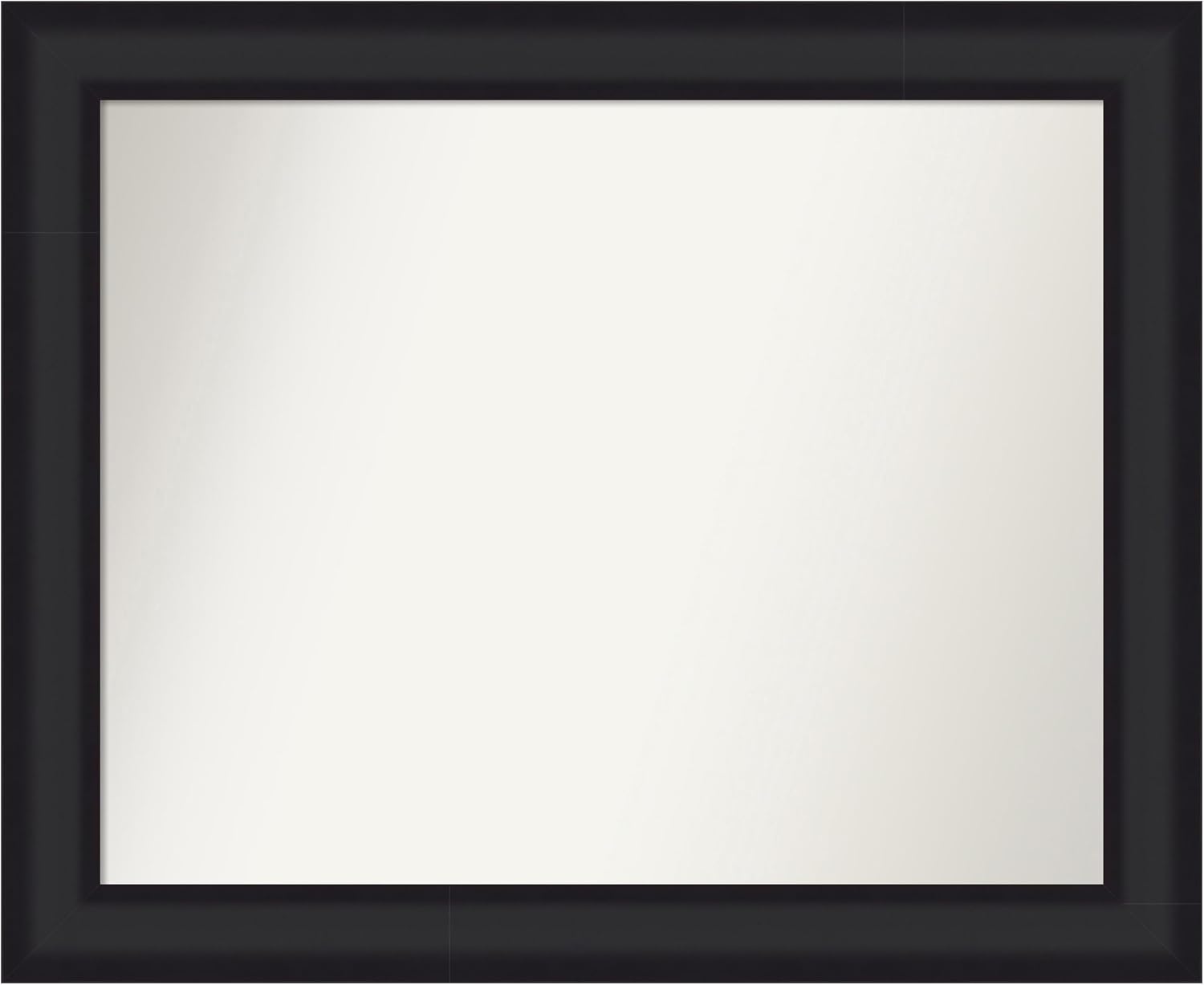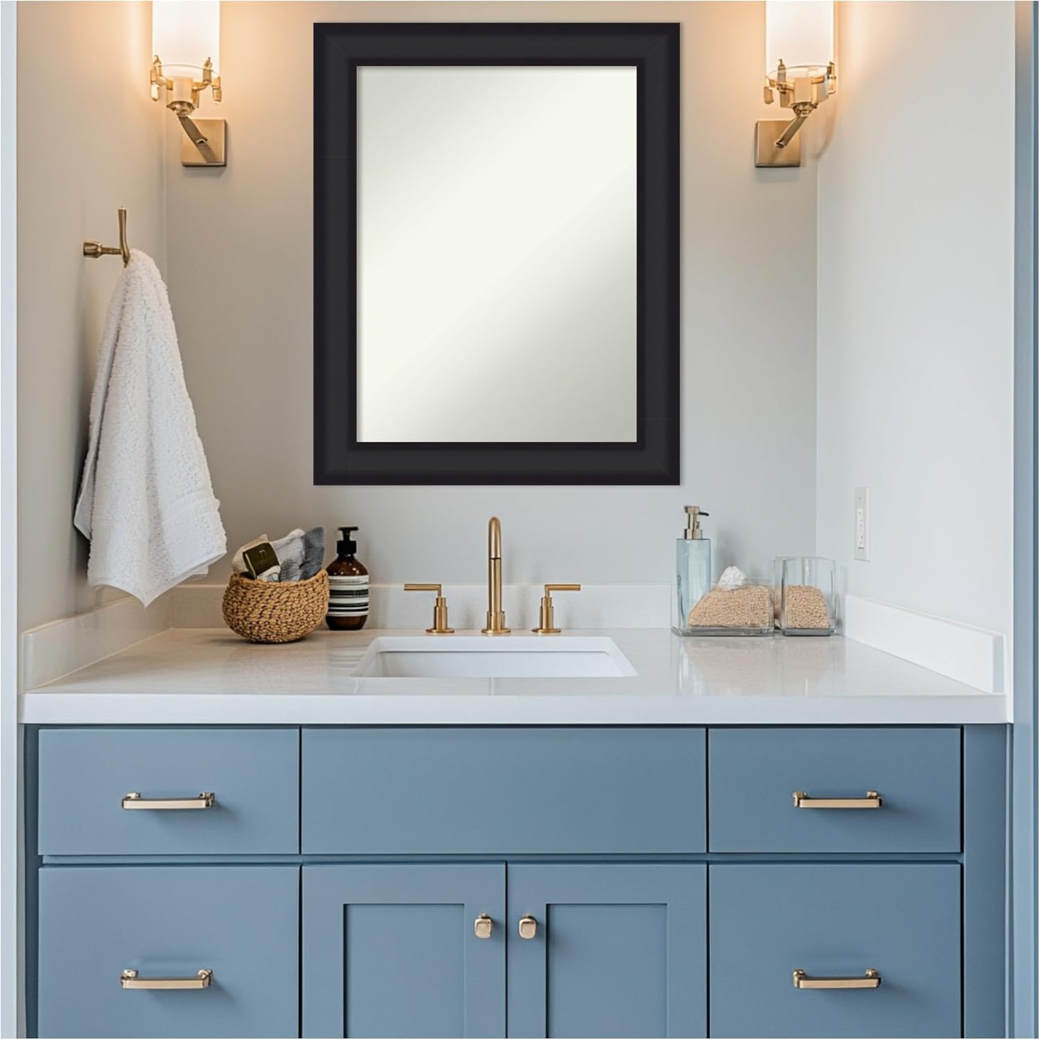 PRODUCT: Amanti Art Non-Beveled Wood Bathroom Wall Mirror; OUTER SIZE: Exactly 23.25 x 29.25 inches; FRAME: Oliver Black; FRAME FINISH: Satin; FRAME COLOR: Black. The Oliver Black frame is a contemporary, black frame with satin finish and a gentle scoop. Give your bathroom the finishing touch with this 100% real wood-framed wall mirror. Individually made using traditional custom framing techniques, it has the quality you would expect from your local frame shop. It holds its value with premium finishing that can be appreciated up close. Because of our attention to detail and focus on artistry, architects, interior designers, and homeowners alike choose this mirror to create beautiful living spaces.