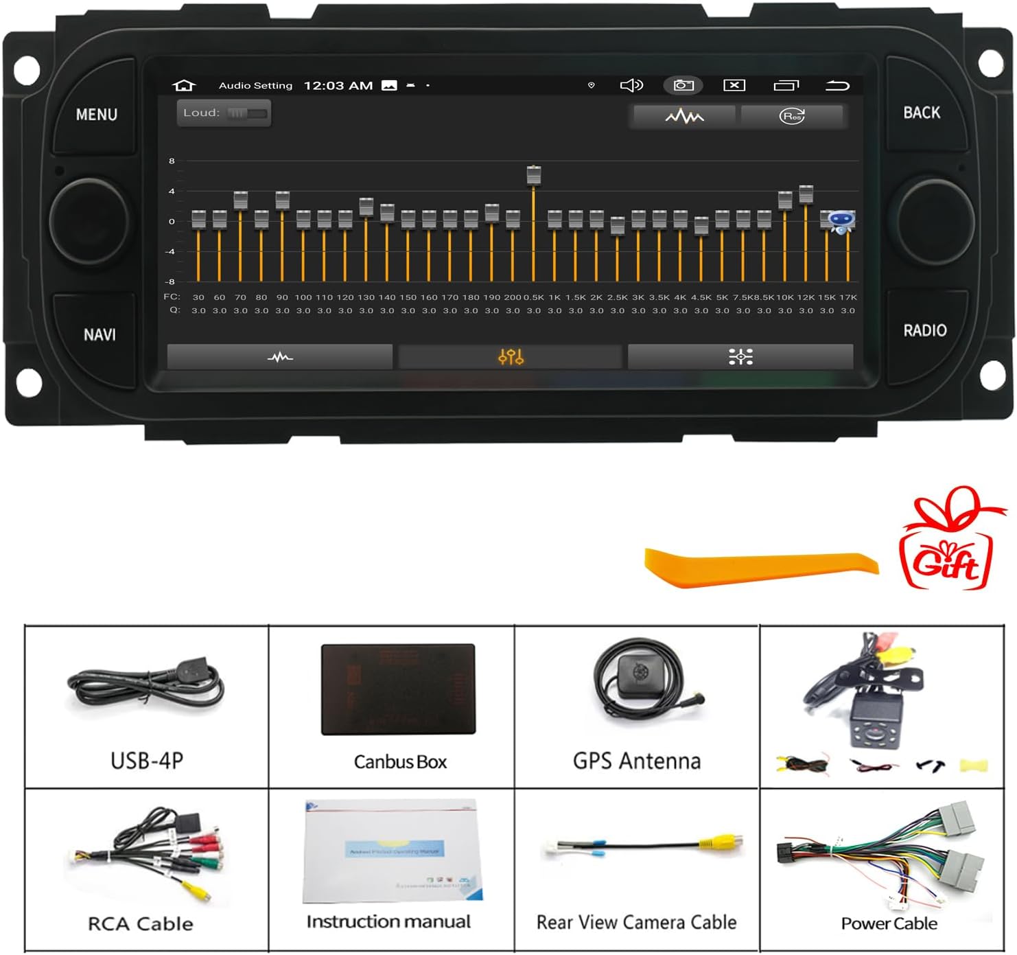 Android car radio stereo, it can compatible with for Chrysler Jeep Dodge select model Screen: 6.86inch IPS touch screen CPU: 4-Core A53 1.5GHz RAM: 2GB DDR ROM: 32GB Display: IPS panel with 2.5D Multi-Touchscreen , highresolution . Multimedia: MP3/WMA/AAC/RM/FLAC,etc. Android 13 system support 3rd party APP Plug and play , easy to install Support wheel control Easy to switch songs,channels and adjust volume etc. Built-in GPS navigation and Maps 10.1inch IPS screen The package come with everything that needed in installation . We suggest keep GPS antenna in glove box instead of behind dashboard to get better signal . Enjoy the new radio on your car.