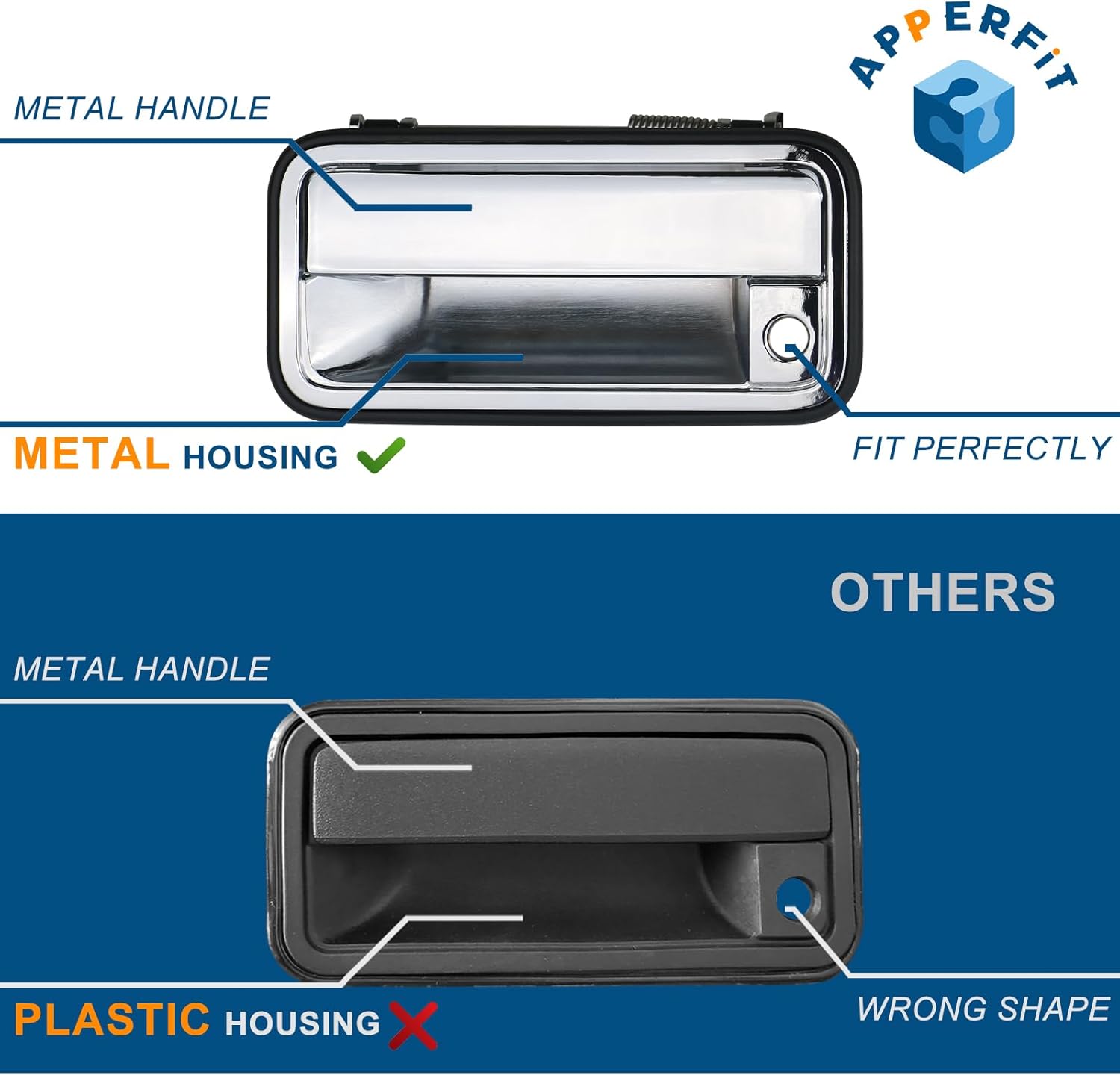 Part name: Exterior Door HandleBrand: APPERFiTCondition: NEWColor: ChromePackage includes: 1*Left Side Door Handle, 1* Right Side Door HandleWarranty: 1-yearFitment:1995-1999 Chevrolet C/K 15001995-2000 Chevrolet C/K 25001995-2000 Chevrolet C/K 35001995-1999 Chevrolet Suburban C/K 15001995-1999 Chevrolet Suburban C/K 25001995-1999 Chevrolet Tahoe1995-1999 GMC C/K 15001995-2000 GMC C/K 25001995-2000 GMC C/K 35001995-1999 GMC Suburban C/K 15001995-1999 GMC Suburban C/K 25001995-1999 GMC Yukon