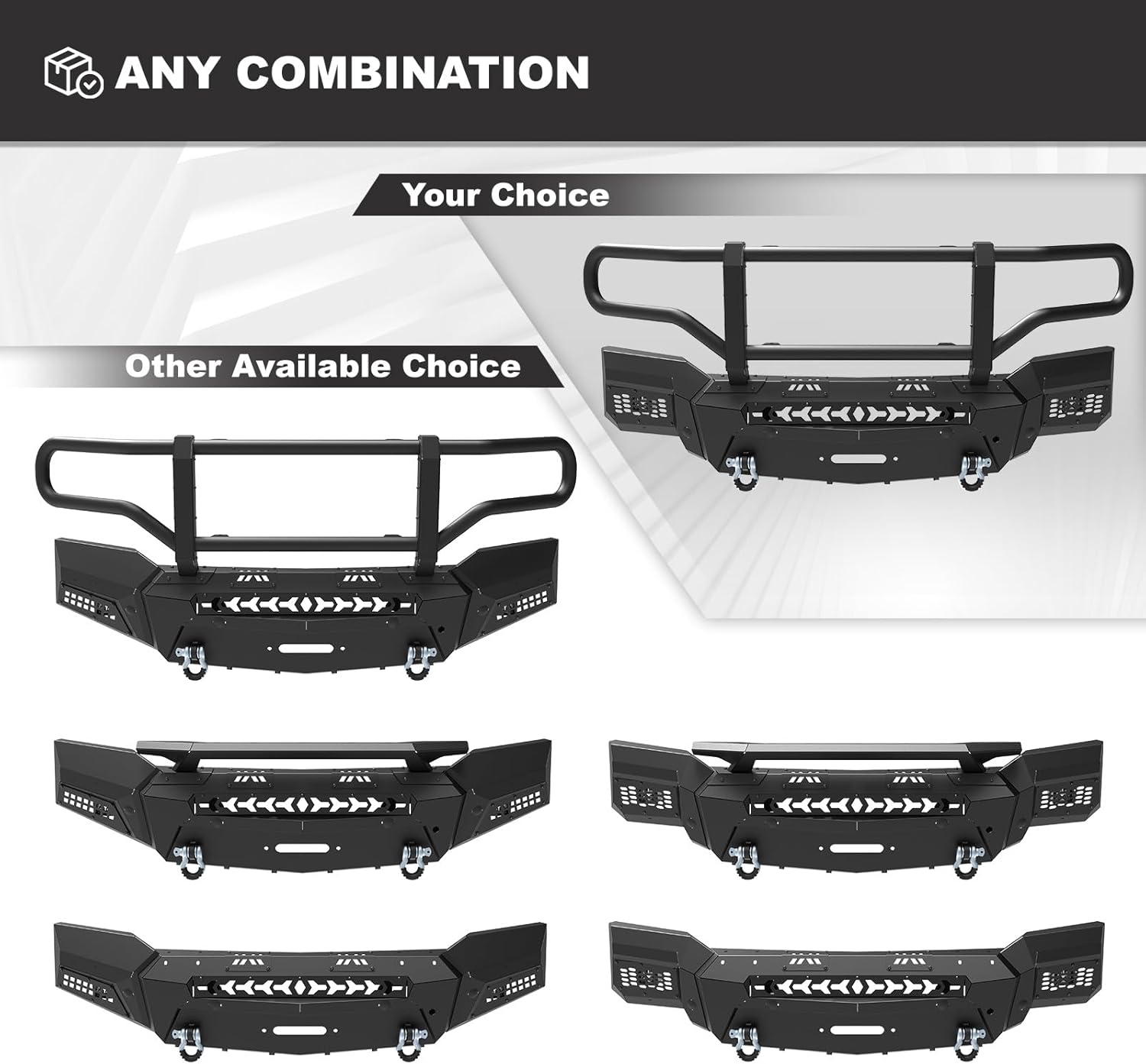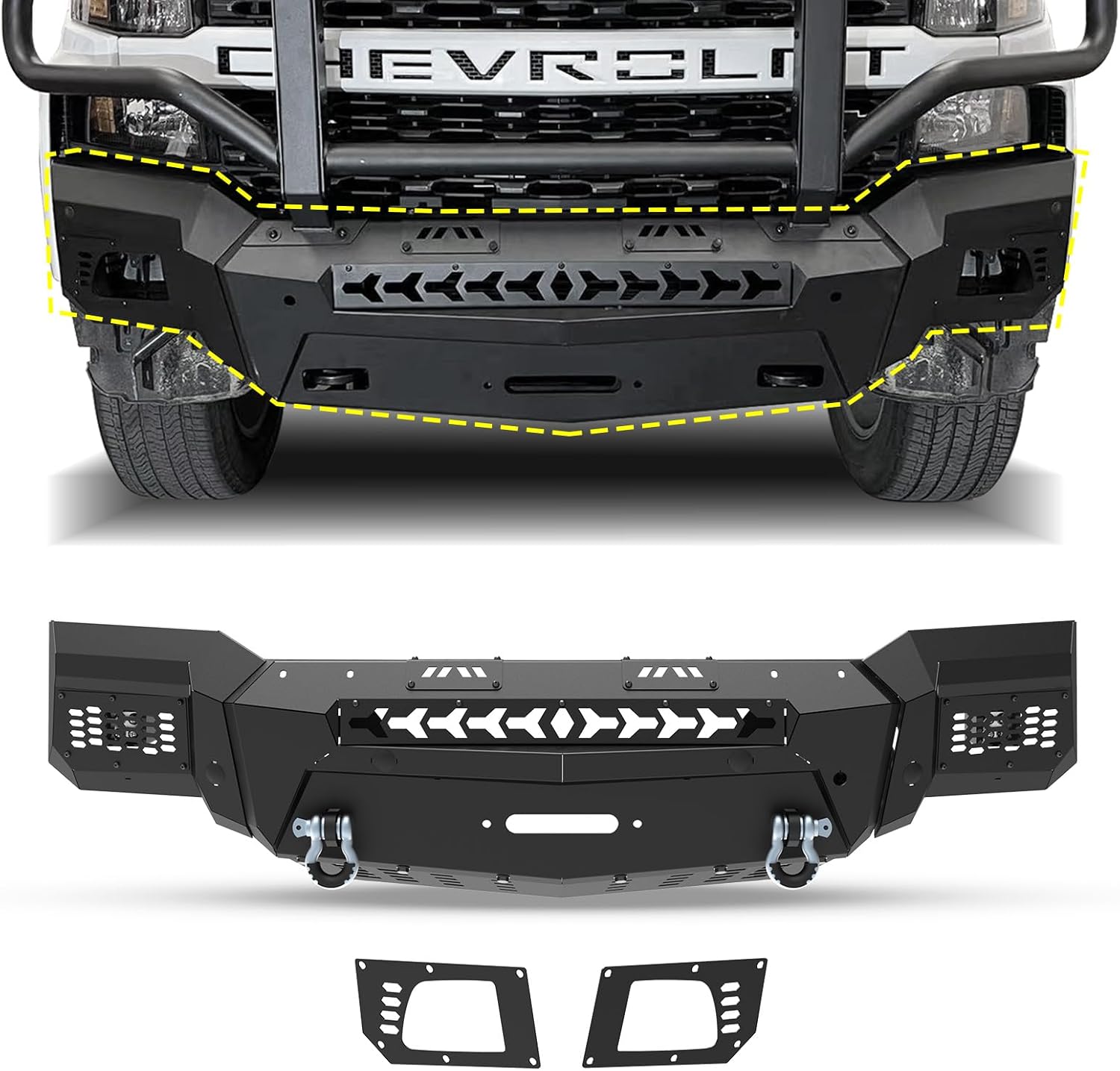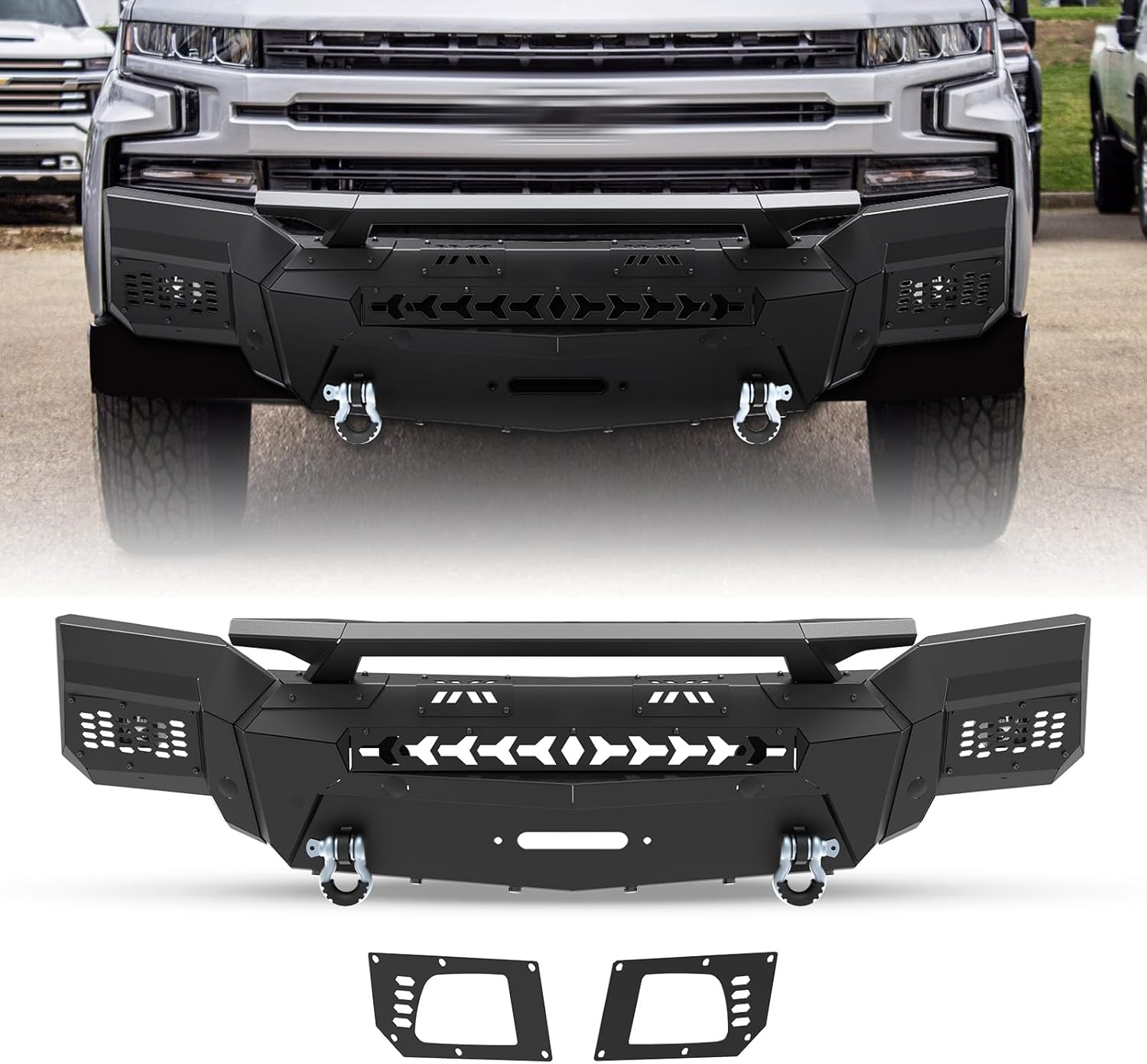 | Included Components | 3-piece modular design chevy front bumpers (Bumper Main Body & Side Wings B & Bull Bar B), All Needed Mounting Accessories |