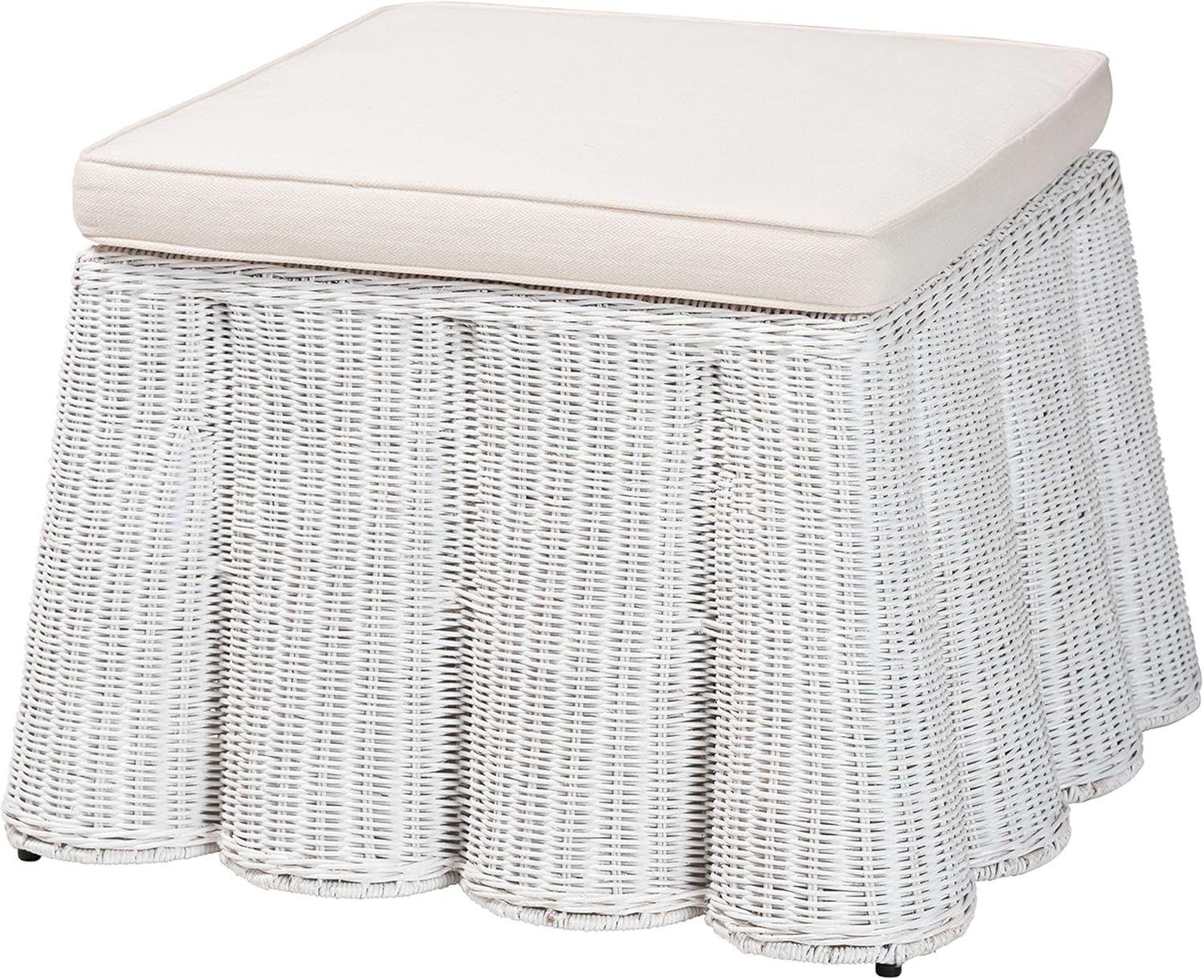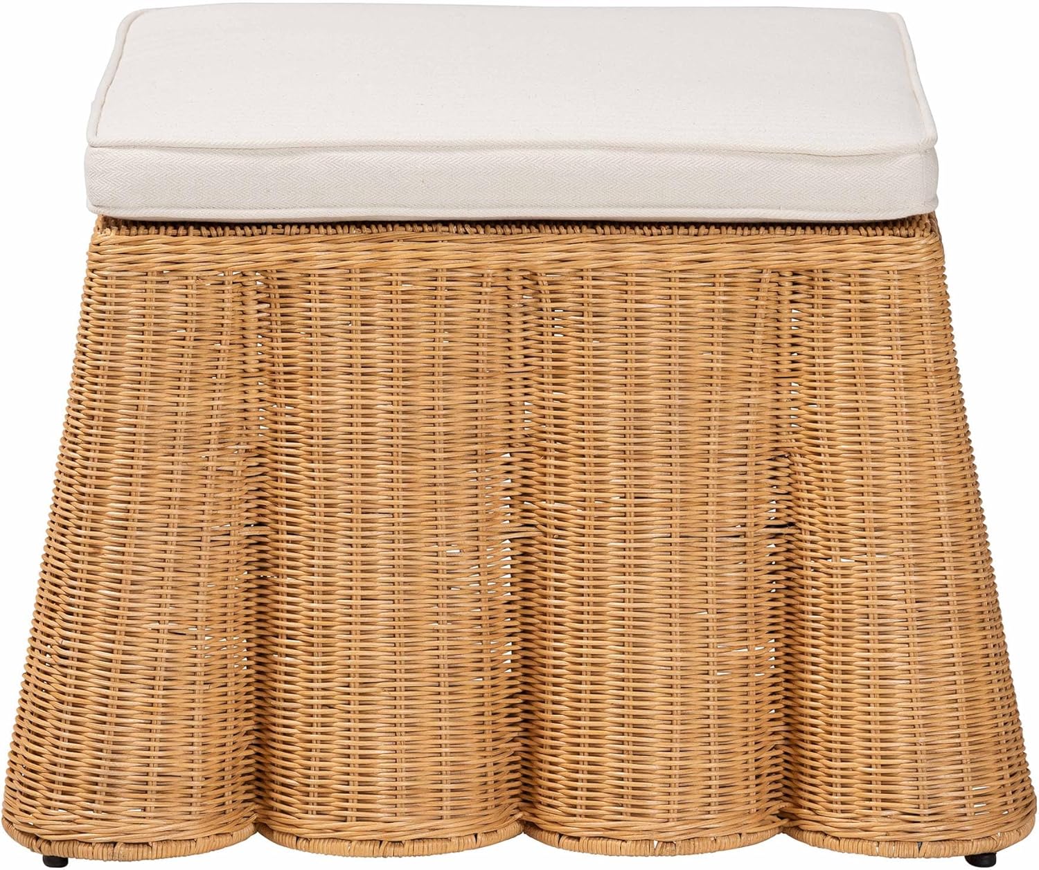 Carry an air of rustic elegance in your space with the stunning Palm ottoman. Made in Indonesia, this bohemian piece consists of a minimalist metal frame embellished with woven rattan meticulously handcrafted by skilled artisans. The scalloped design of the base creates a soothing presentation that draws attention to remarkable craftsmanship of the piece. The Palm will arrive fully assembled and is topped with a plush fabric upholstered cushion to serve as a cozy footstool or extra seating as needed. Uplifting the quality of any layout, the Palm ottoman brings a breath of exotic grace. Disclaimer: Rattan is a product of nature and may have variations in areas such as, but not limited to, color, pattern, grain and texture. The hair-like strands of rattan/rattan-fiber are common due to the nature of the material.