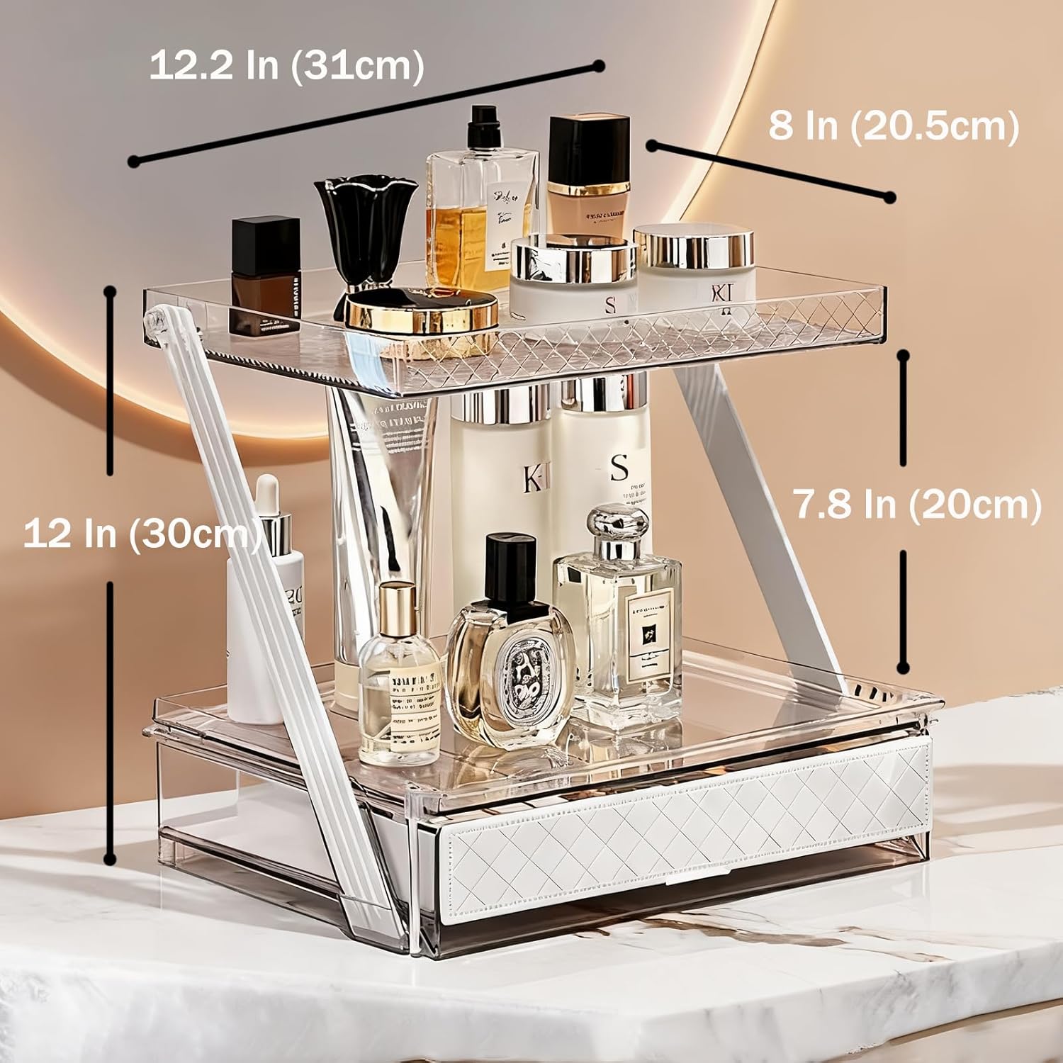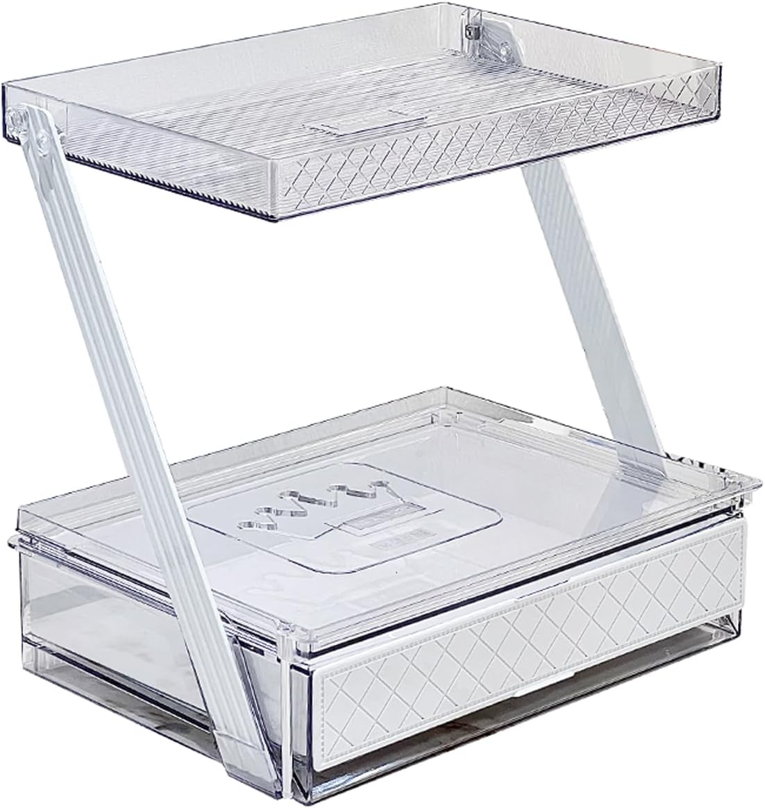Product Description Material Type: acrylic + metal Key Features Z-shaped 2-tier organizer delivers 3-tier storage without taking extra countertop space. Retractable drawer-top tray slides smoothly for easy access to frequent makeup/skincare. Top tray adjusts to 45° tilt or horizontal for convenient use of lipsticks/jewelry. Keeps all items clearly visible, saving time on searching for daily essentials. Ideal for vanity countertops/bathroom dressers—ideal for small-space organizing.