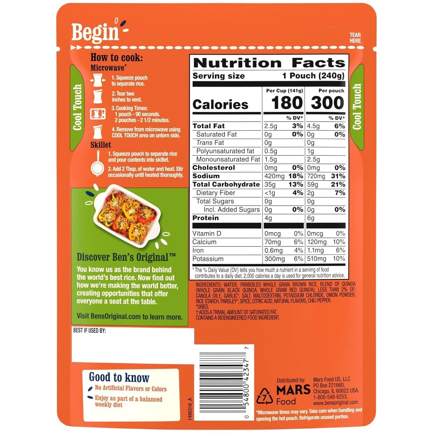 BEN'S ORIGINAL Ready Rice Whole Grain Medley Quinoa and Brown Rice delivers wholesome seasoned parboiled rice that is ready to eat in seconds. This convenient microwave rice pouch offers a medley of pre-cooked whole grain brown rice with red and black quinoa, infused with the tempting taste and aroma of roasted garlic for a delicious savory cooked rice side dish you'll love. Ready Rice comes in a BPA-free microwaveable rice pouch that eliminates prep and cleanup to help you prepare a tasty meal with little effort. All you have to do is cook the rice in the microwave for 90 seconds. You can also pour the contents of the rice pouch into a skillet and heat thoroughly before serving. Ready Rice Whole Grain Medley tastes great plain or paired with your favorite meats and vegetables. This flavored rice is made with 100% whole grains, contains no artificial flavors, no artificial colors, no trans fat, or cholesterol and is low in saturated fat. Ben’s Original is dedicated to creating meals and experiences that offer everyone a seat at the table.