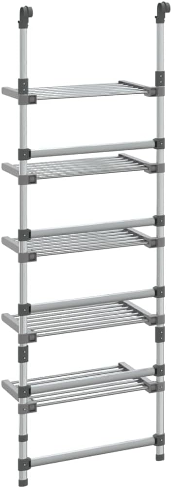 This classic 5-tier hanging laundry drying rack is an ideal choice for families with limited drying space!Stable frame: The aluminum frame of the clothes drying rack ensures sturdiness and stability.Features :- Space-saving design: Each of the drying tier racks can be folded separately, which can save space when not in use,- Adjustable height: This clothes hanger can be extended from 57.9" to 73.6" in height, so you can choose the most suitable height as per your need.- Easy hanging: You can simply hang the clothes airer on the door or shower screen with 2 hooks. It is also suitable for wall mounting with its unique design.Color: Silver- Material: Aluminum, PS (polystyrene), PE (polyethylene), PP (polypropylene)- Overall dimensions: 19.7" x 9.8" x (57.9"-73.6") (W x D x H)- Adjustable height- Assembly required: Yes- Overall dimensions: 19.7" x 9.8" x (57.9"-73.6") (W x D x H)Specifications :- Dangerous Goods Regulations : not applicable- Included Components : vidaXL 5-Tier Aluminum Hanging Laundry Drying Rack in Silver- Manufacturer : vidaXL- Model Name : vidaXL 5-Tier Aluminum Hanging Laundry Drying Rack in Silver- Model Number : 344384- Number of Boxes : 1- Number of Items : 1- Product Uses Batteries? : No- Fabric Type : not applicable- Search Related Keywords : hanging laundry drying rack, hanging laundry drying racks, drying rack, clothes drying rack, laundry drying rack, clothes hanger, clothes hanger rack, hanging drying rack, hanging clothes drying rack, clothes airer, drying tower, tower dryer,
