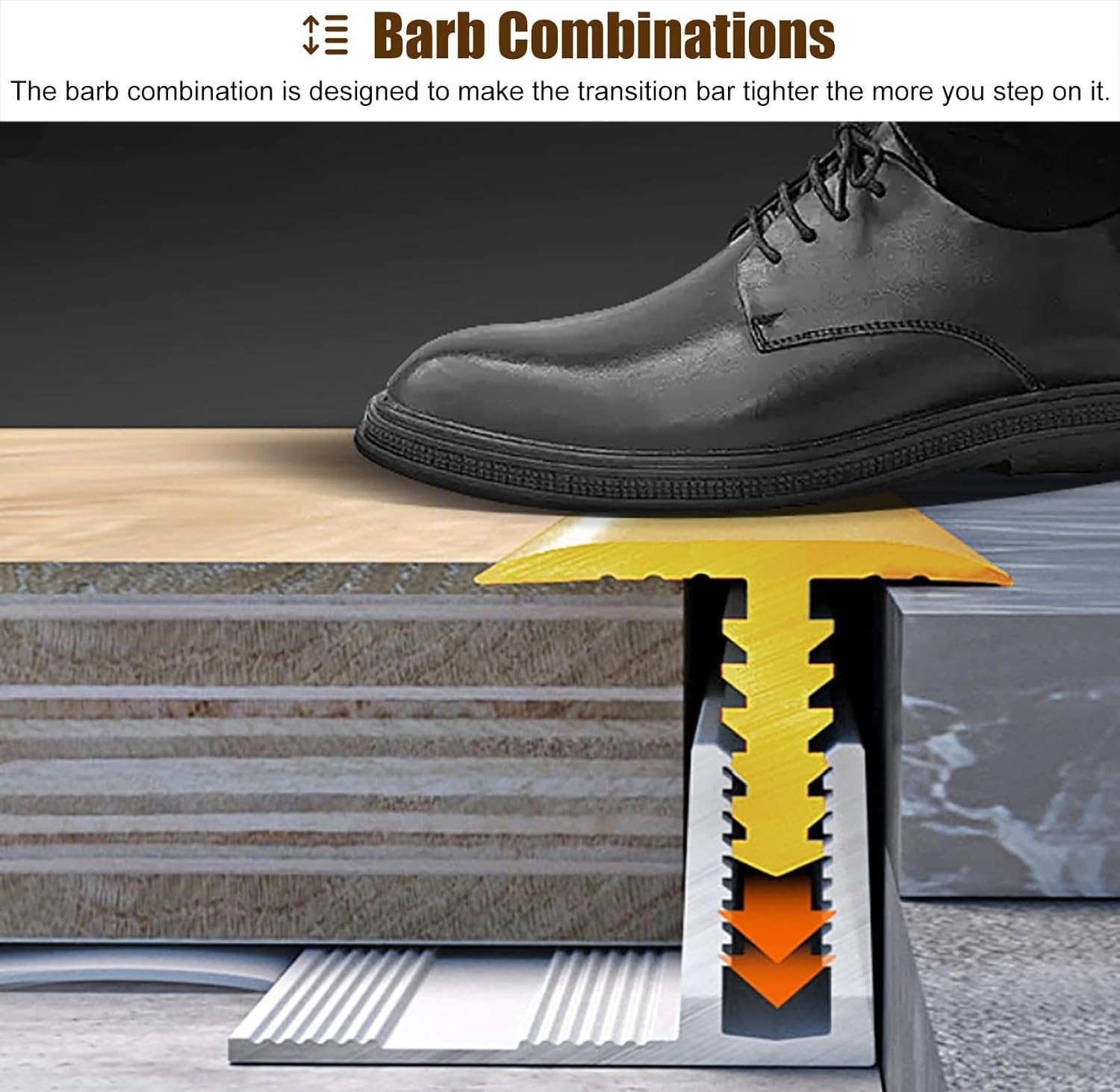 Our transition strips are durable and easy to install, helping to maintain the professional, seamless finish of your floor. Our transition strips can help you improve your residential and commercial spaces. Package Content: -1 x Floor Transition Strip - 1 x Aluminum Alloy Base Specifications: - Material: aluminium alloy. - Overall Length: 39 3/8" - Thickness: 1.8 mm. - Width: 36 mm. - Height: 12 mm. - Applicable height range: 12mm-15mm, 18mm-20mm Function: - Made of aluminum alloy and brass material, no deformation. - The surface is hard, wear-resistant and easy to clean. - Secure with a base to protect your floor from damage. - The height is adjustable to suit different board thicknesses. - Widely used for interior decoration during house renovation. - A variety of sizes for you to choose from to meet your needs. Note: - Please allow 1-3mm error due to manual measurement. - Due to the difference between recording lamps and monitors, there may be color differences. Please refer to the actual product. - Due to length restrictions for shipping the package, items larger than 150cm will be shipped in pieces. The default cut is 2 pieces of 135 cm. If you need to cut to other sizes, please contact us by email. - During the installation and tapping process, you can put a thick cloth to protect your transition strip from damage. Quality Service: - If you have any questions about our product, please contact us by email and we will give you the most satisfactory solution.