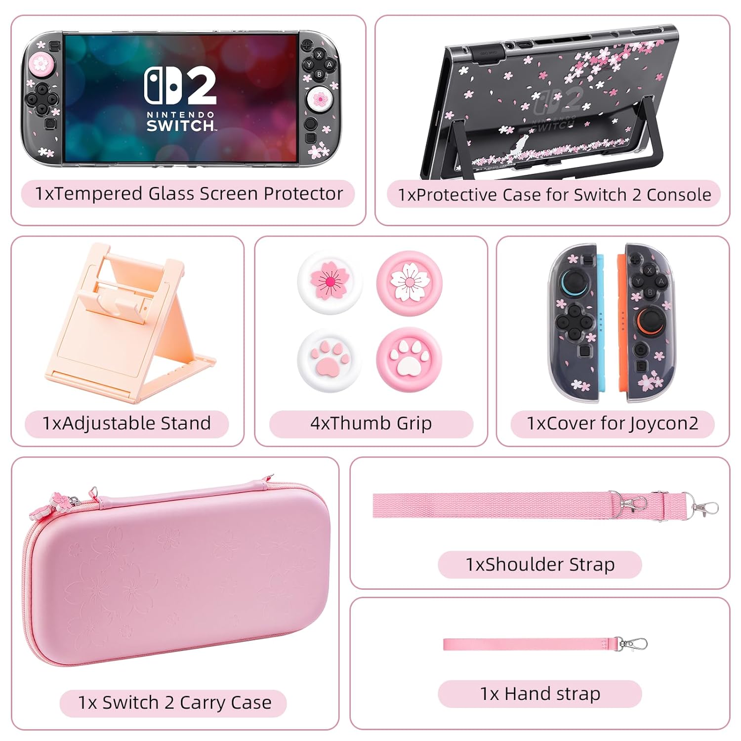 | Included Components | 1x Pink Case for Switch 2. 1x Protective Cover Set. 1x Ultra-thin Adjustable Stand. 1x Hand strap. 1x shoulder strap. 1x Tempered Glass Screen Protector. 4x Thumb Grips Caps. |