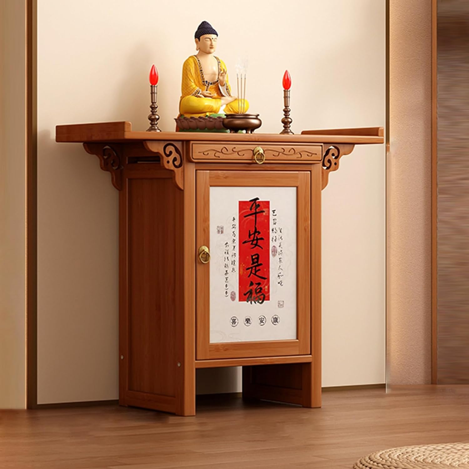 Buddhist Meditation Cabinet Meditation Altar Cabinet Altar Table with Drawer with Storage Layered Display Altar TableThis Buddhist Altar Table combines a refined new Chinese design with spacious functionality, featuring a large altar area with a clean, uniform finish inside and out. The wide drawer and multiple storage zones provide organized space for incense, scriptures, or ritual items, while the classic upturned edge design prevents items from slipping. A practical pull-out offering tray adds convenience, and the thickened bamboo construction with an elevated base ensures stability. With its widened depth and generous storage capacity, this Meditation Altar Cabinet works as a Meditation Table, Chinese Buddhist Cabinet, or Altar Table with Drawer, making it for temples, ancestral halls, or home worship spacesProduct SpecificationsProduct Name: Buddhist Meditation CabinetDimensions: 28x28x51cm/11.02x11.02x20.08inColor: Walnut, BrownMaterial: BambooInstallation: AssembledUse: Suitable for ancestral halls, temples, sacrifices, incense burning, divination, commemoration, and various ceremonies.Suitable for both formal and casual settingsSuitable Locations: Living rooms, bedrooms, balconies, shrines, ancestral halls, and templesPackage Includes: 1 altar tableNote:This product only includes the altar table; other Buddhist statues and other decorative items are not included.Due to manual measurement, slight discrepancies of 0-3 cm may occur. Please confirm the dimensions before purchasing.