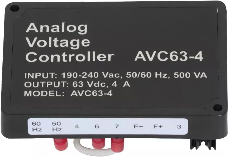 Package Include:1Pc AVC63-4 Automatic Voltage Regulator1Pc product Instructionsput 190-240VAC 4A Automatic Voltage RegulatorVoltage 190-240VACFrenquency 50/60Hz,Jumper selectableVoltage Max 73VDC@220VAC inputCurrent Continuous 3.5A , intermittent 7A for 10 secs(52/105VDC)Resistance Min.15 ohm , Max 100ohmVoltage Build-up residual voltage at avr terminal >5VACOperating Temperature (-40°C to +60°CStorage Temperatue (-65°C to +85°CExternal Volts Adjutment ±10% with 2k ohm 1 watt trimmerThe design is generous, yet simple and exquisite