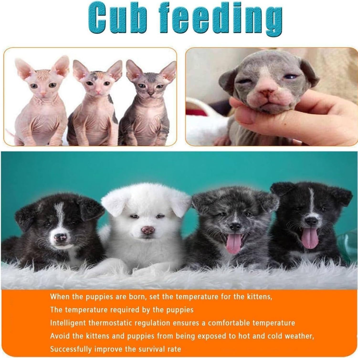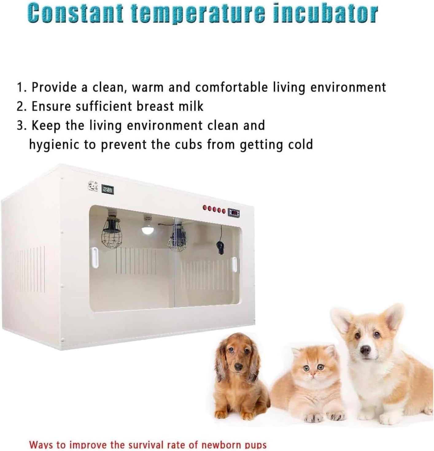 Kitten incubator Provides a clean, warm and comfortable living environment to ensure that kittens have enough breast milk and avoid frostbite. This is a perfect incubator, take it home!Specifications:Product name: Kitten incubatorVolume:60*50*50 cm/23*20*20 inches80*50*50 cm/32*20*20 inches100 x 60 x 60 cm / 39.3 x 23.6 x 23.6 inches (104 x 64 x 20 inches)Net weight: 16 kg / 20 kg / 34 kgFeatures:- LED lighting, ceramic heating lamp, equipped with professional lamps, reasonable layout.- Special lamp design, more environmentally friendly, sealed wire box to prevent cats from scratching and biting.- Dynamic monitoring of temperature and humidity throughout the process, intelligent constant temperature adjustment, successfully improving the survival rate.- Circulating air keeps the air in the box fresh, and multiple vents ensure air exhaust. The puppy incubator is equipped with independent switch control, which is convenient to use.Package Included:1 Puppy Cat IncubatorWe sell quality products at the best price and excellent service. Your questions will be answered within 24 hours. If you have any questions, please feel f ree to contact us.