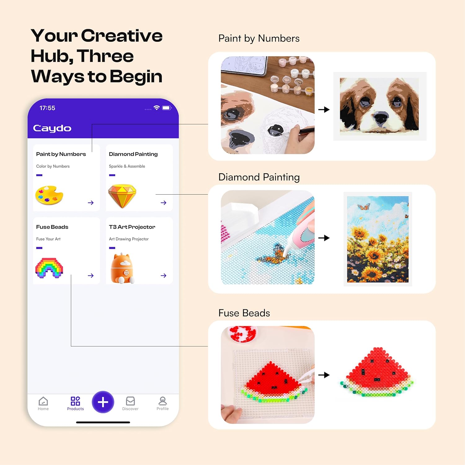 | Included Components | 3 premium A4 canvases, 60 vibrant acrylic paints, 3 quality brushes, 3 blending sponges, a frame, and access to the user-friendly Caydo Technology app for creating custom designs. |