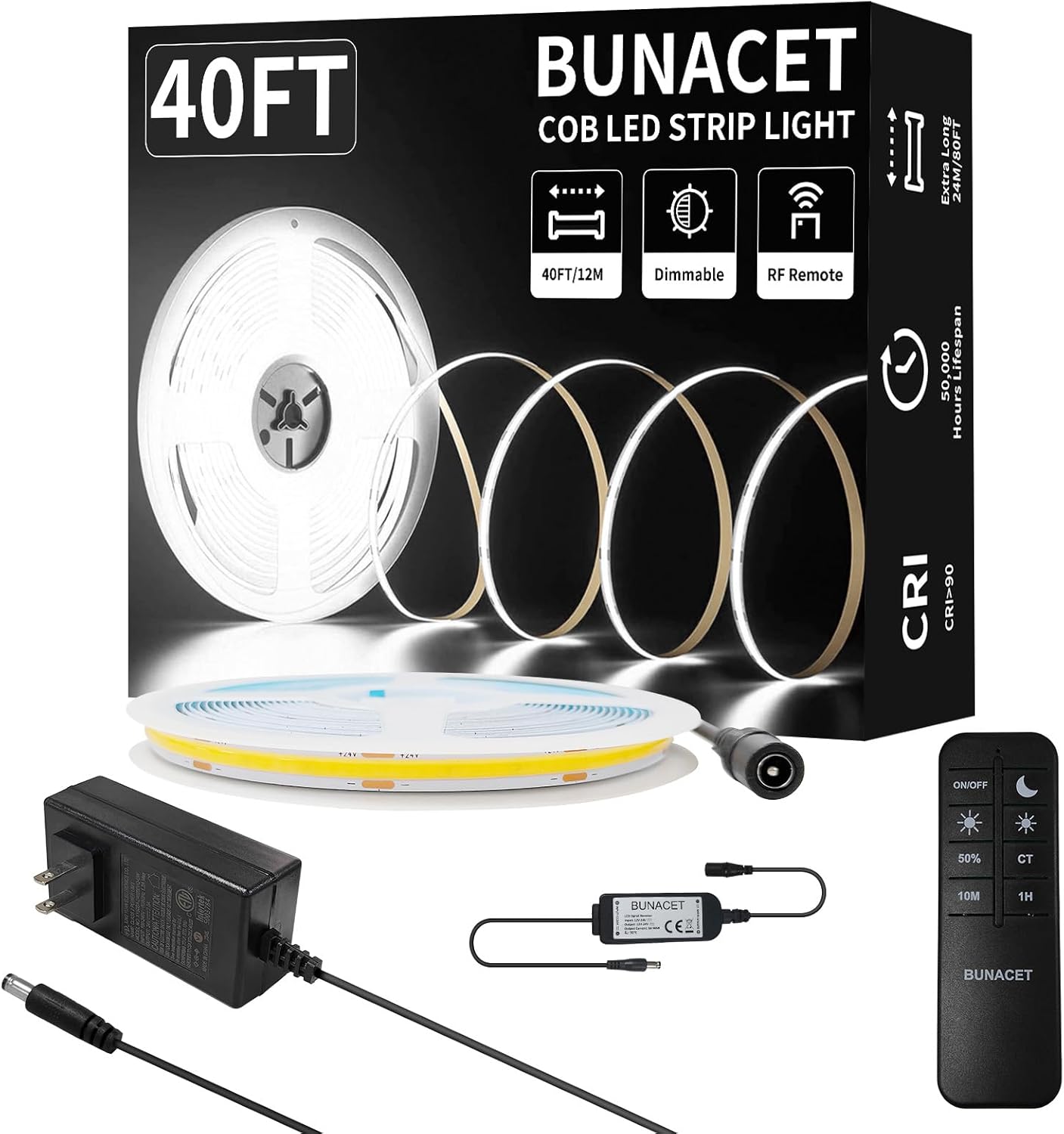 | Included Components | 24V 3A US Listed Power Adapter * 1, 40FT COB Strip Lights * 1, Fixed Clip * 10, RF Remote Control (Need AAA x 2 batteries, NOT INCLUDED) * 1, Signal Receiver * 1 |