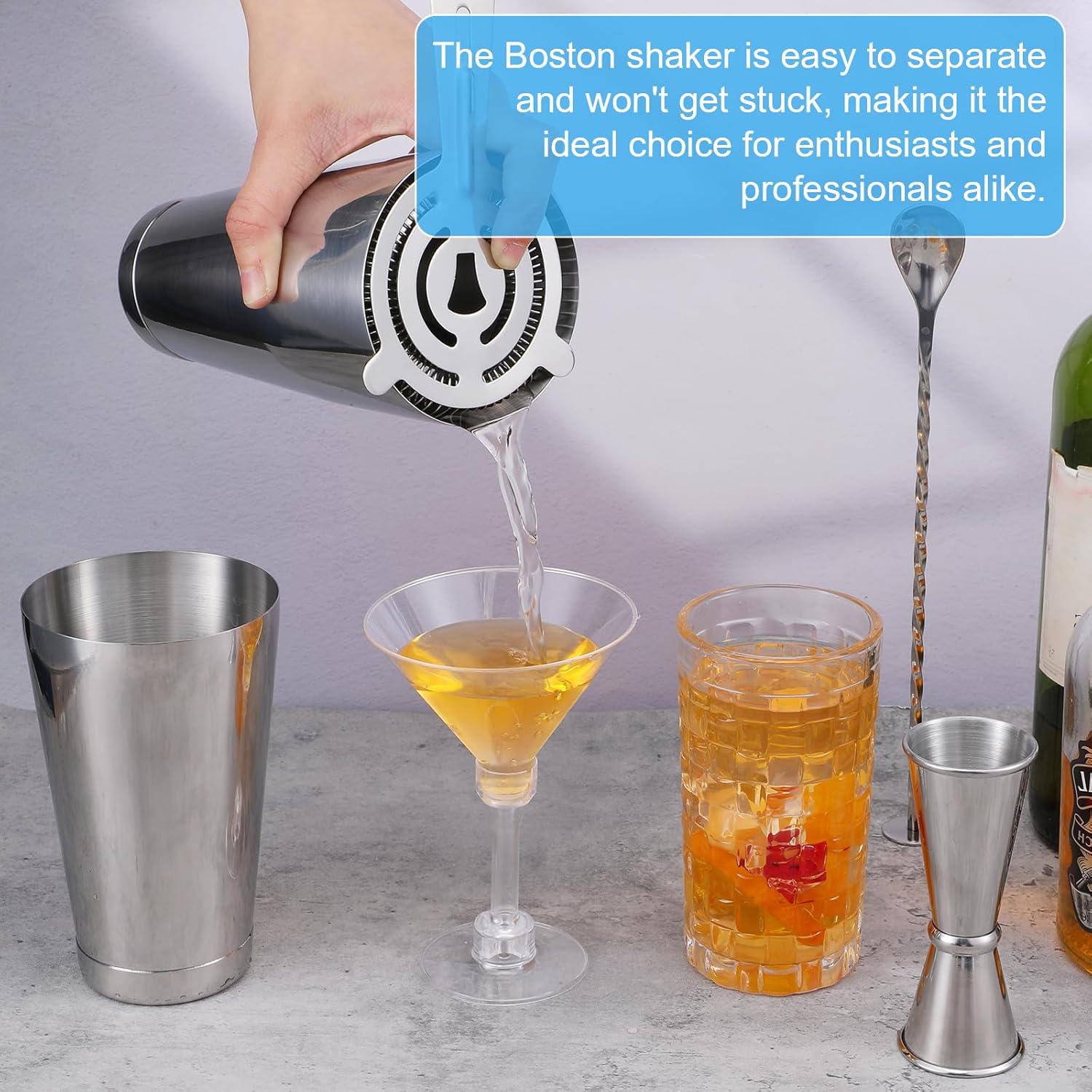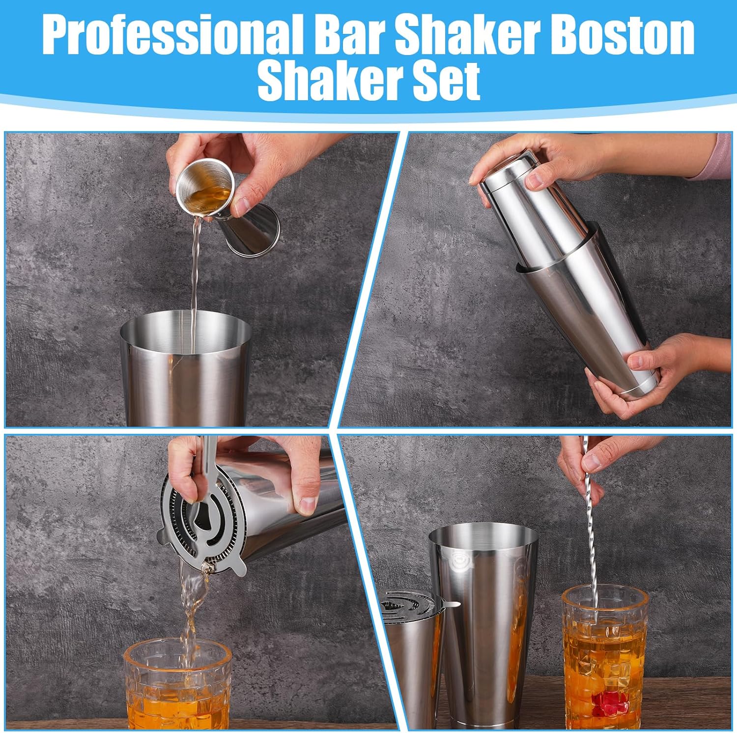 Product Description:This 15-piece Boston cocktail shaker set, made of silver stainless steel, combines professional texture and practical performance, making it an ideal choice for bartending enthusiasts and professionals. The set includes 3 large 28-ounce shakers, 3 small 18-ounce shakers, 3 double-headed jiggers, 3 spiral bar spoons, and 3 strainers. The full set of tools covers the entire bartending process from measuring, stirring to shaking and straining, easily meeting the needs of making various drinks.Key Points: 1. 15-piece all-round configuration, suitable for all scenarios. 3 large shakers can mix drinks in batches for gatherings, 3 small shakers are perfect for single-serve needs. The spiral bar spoon with a long handle reaches the bottom of the shaker to ensure even mixing of ingredients, and the strainer effectively blocks fruit residues and ice cubes, easily handling family gatherings and bar service. 2. Food-grade stainless steel, sturdy and safe. Made of 304 stainless steel, it has a delicate and high-end silver metallic luster, resists alcohol corrosion, is not easy to rust, and won't deform even after repeated shaking and collision, maintaining a good condition after long-term high-frequency use. 3. Beginner-friendly design, leak-proof and easy to operate. Allowing you to make classic cocktails such as Mojito and Margarita without professional skills. 4. Easy to clean. Thanks to its premium stainless steel construction and smooth surface, this Boston shaker set is extremely easy to clean. Whether you choose to hand wash or put it in the dishwasher, cleaning won't take long.5. Suitable for all groups, an excellent gift choice. Professional bartenders can use it as a core tool, home enthusiasts can create their own mini bar, and beginners can get started with it; it is a perfect gift for festivals, housewarmings or for fellow enthusiasts, which can convey a delicate life attitude and become a must-have item in bar tool collections.