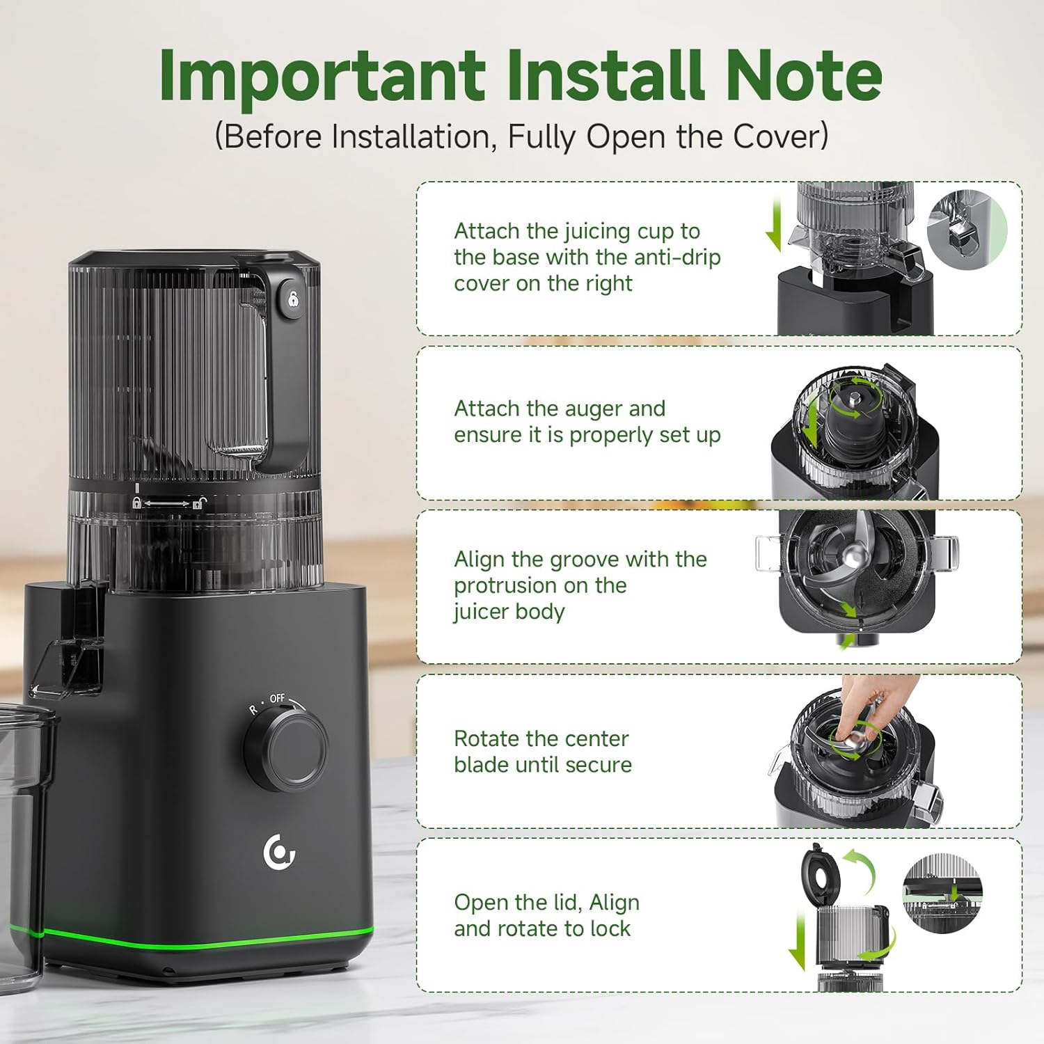 | Included Components | 2 Cups(For juice, Pomace, 2 Filters (For Juice/Sorbet/Nut Milk), 600W Max Motor Base, Feeding Cup & Juicing Body & Auger, Pushing Rod & Cleaning Brush |