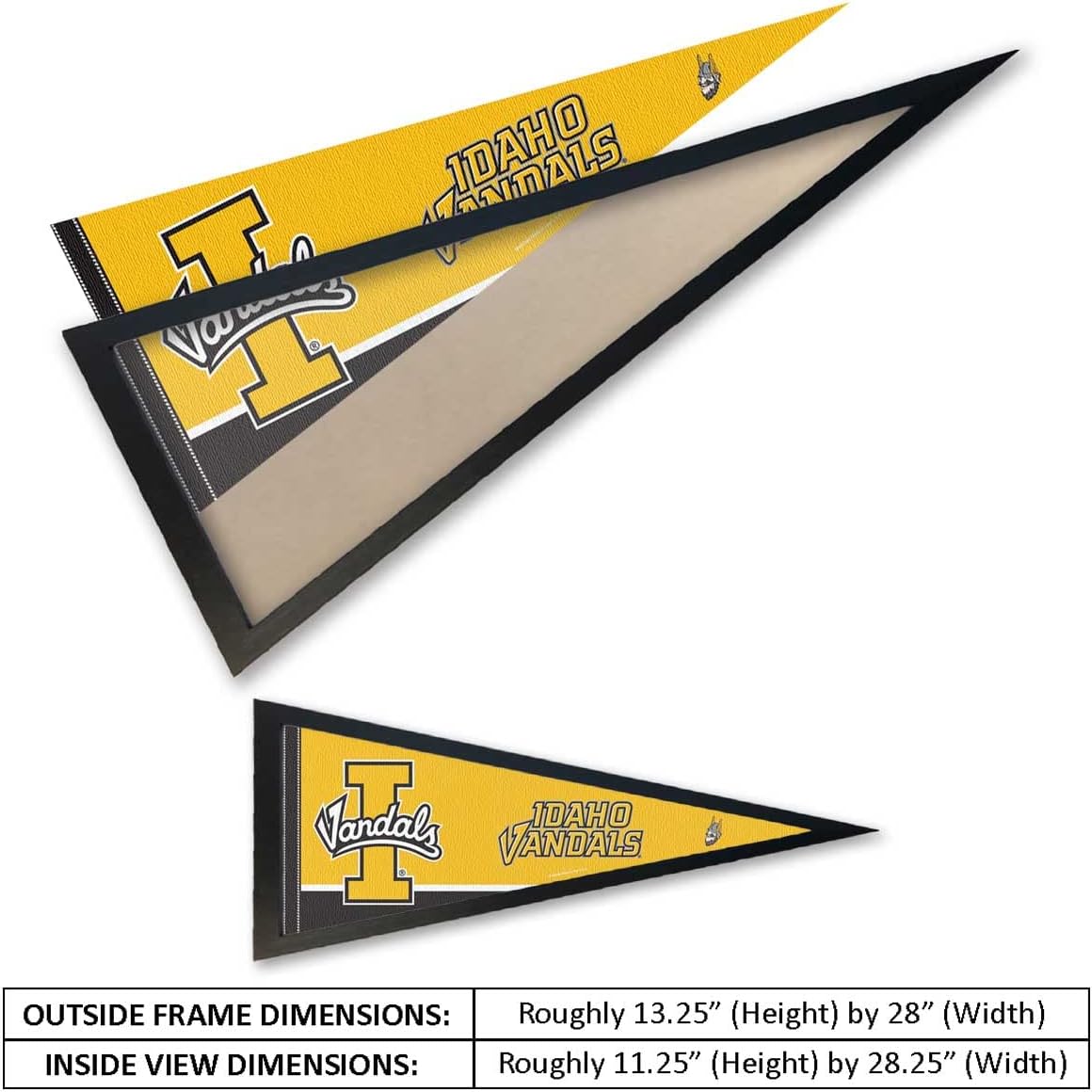Idaho Vandals Pennant and Wood Pennant Frame includes a 12x30 inch soft poly felt Officially Licensed pennant and the recommended Pennant Frame which is made of solid poplar wood.The pennant is full size, single sided screen printed, and is ideal to display on any wall of your home, office, gameroom, or as a banner. The Pennant Frame is 13.25 x 34.25 inches, made of poplar wood moulding, stained black satin, includes a plexiglass front, and fits this pennant perfectly. Please Note: The pennant frame has a protective plastic film on both sides of the plexiglass. Please peel off from both sides when ready to use.