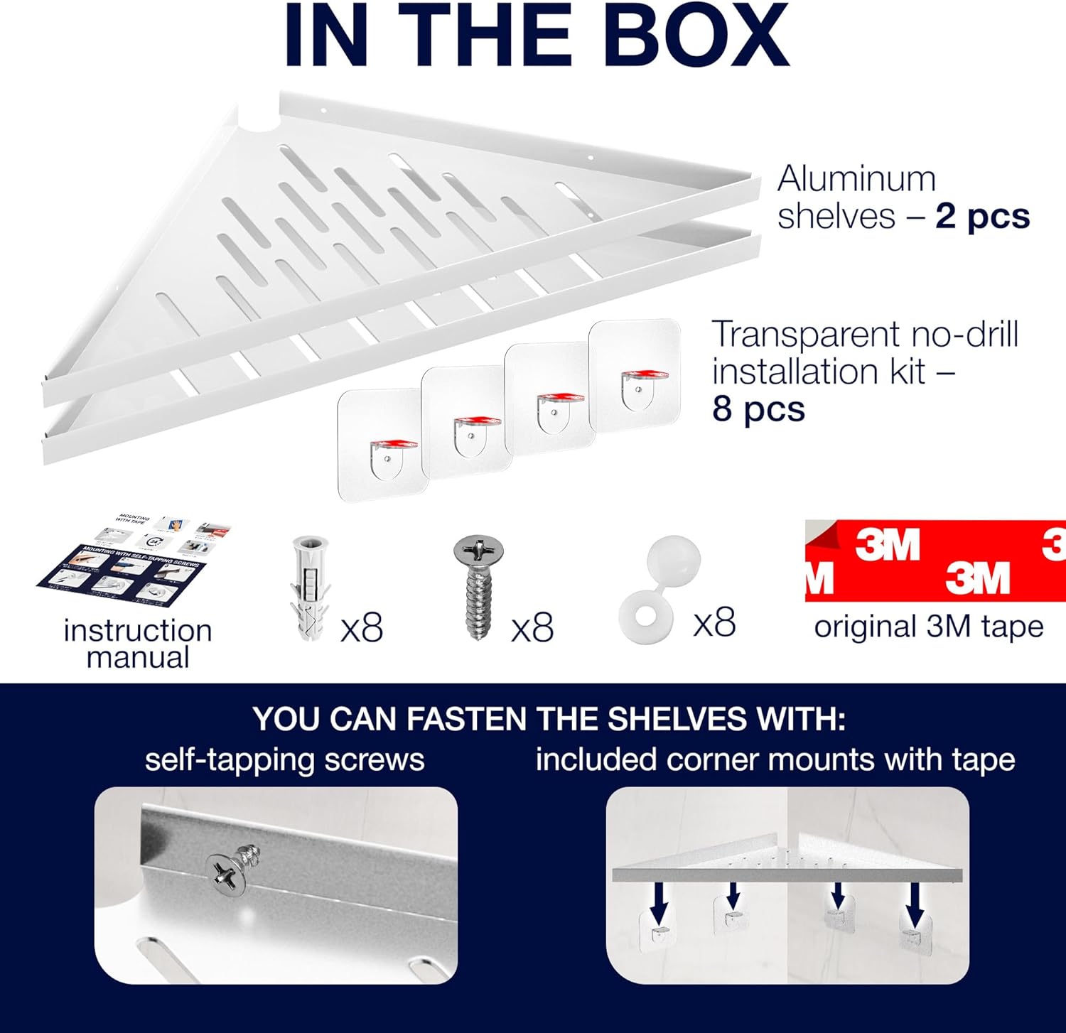 | Included Components | Shelf - 2 piece, mounting dowels with screws - 8 pieces, 3M mounting tape, installation instructions |