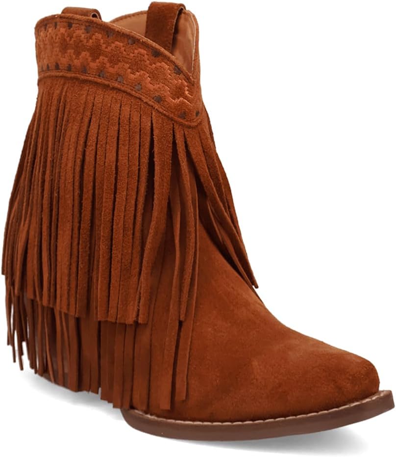 Tapadero features luxurious all-over suede and playful layered fringe. These booties are designed to make a statement while keeping you comfortable all day long. Whether you're dressing up or keeping it casual, these booties add a touch of bohemian charm to any outfit. Step into Tapadero and experience the perfect blend of fashion and comfort with every step.