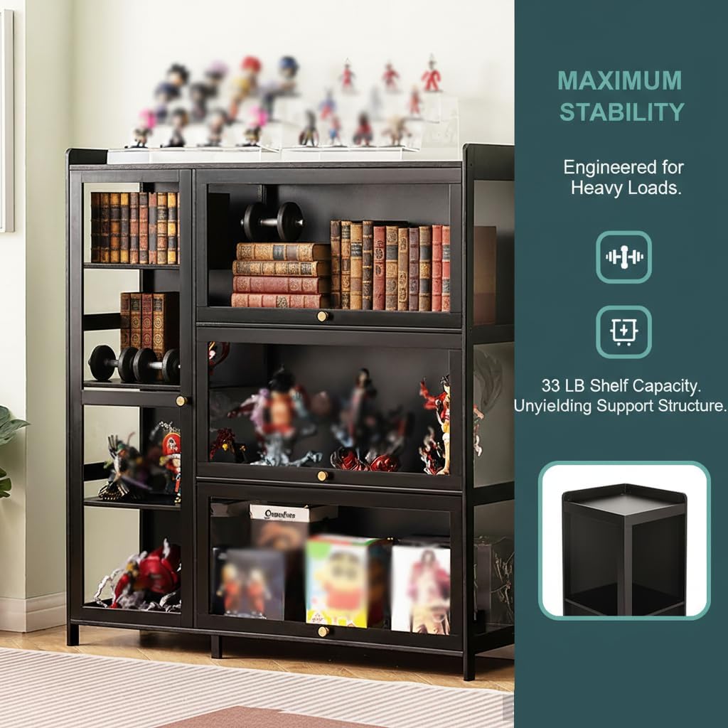 Display Cabinet with Acrylic Doors, 7 Storage Spaces Storage Cabinet & Curio Cabinet with Clear Acrylic Doors, Modern Black Bamboo & Composite Wood for Collectibles, Kitchen, Living Room