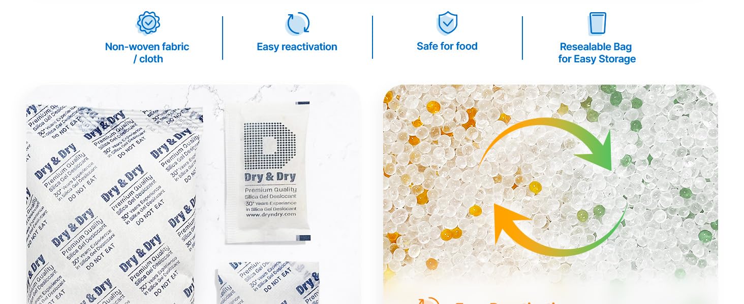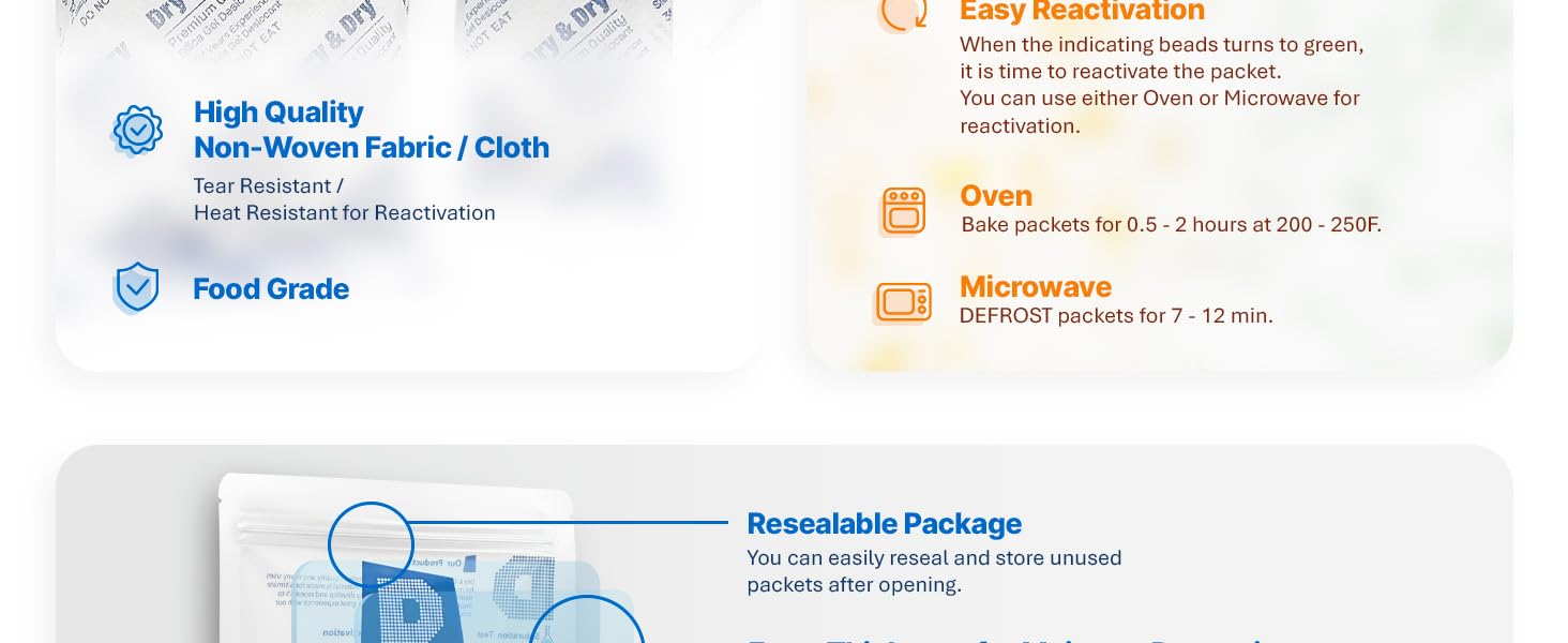 • [Ultimate Moisture Absorption and Reactivation] Packet Material is Special Fabric by Spunbond Technology; For reactivation, place packets in the Oven for 0.5 to 2 hours at 200 to 250F or Microwave for About 7 to 12 Minutes at Defrost Mode