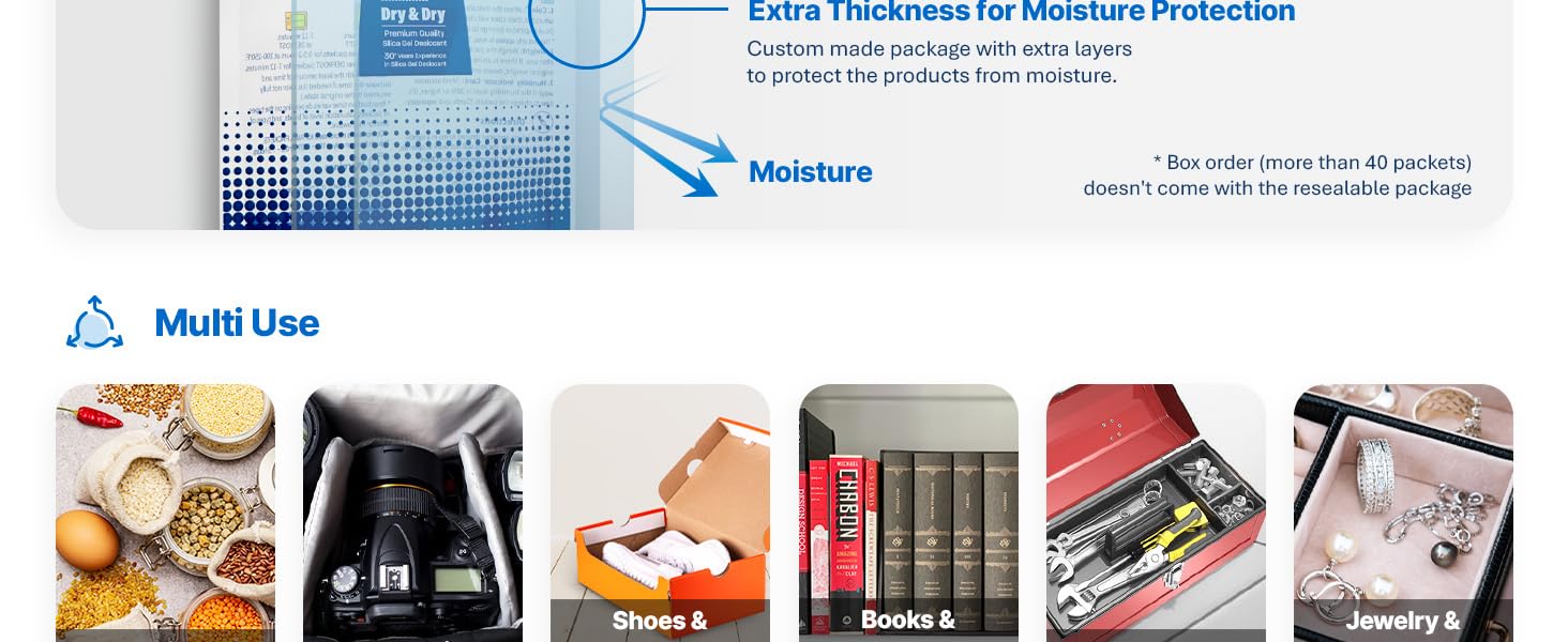 • [How To Use] Place your items and silica gel packets in a tightly sealed container to protect your items from moisture damage; Use silica gel packs to protect 3D Filaments, Safes, Guns, Ammos, Canister, Collectables, Jewelry, Documents, Camera Lens, Clothes, Cosmetics, Books, Bags, Decorations, Wet phones, Cameras, Watches, Electronics, Shoes, and Many Other Valuables