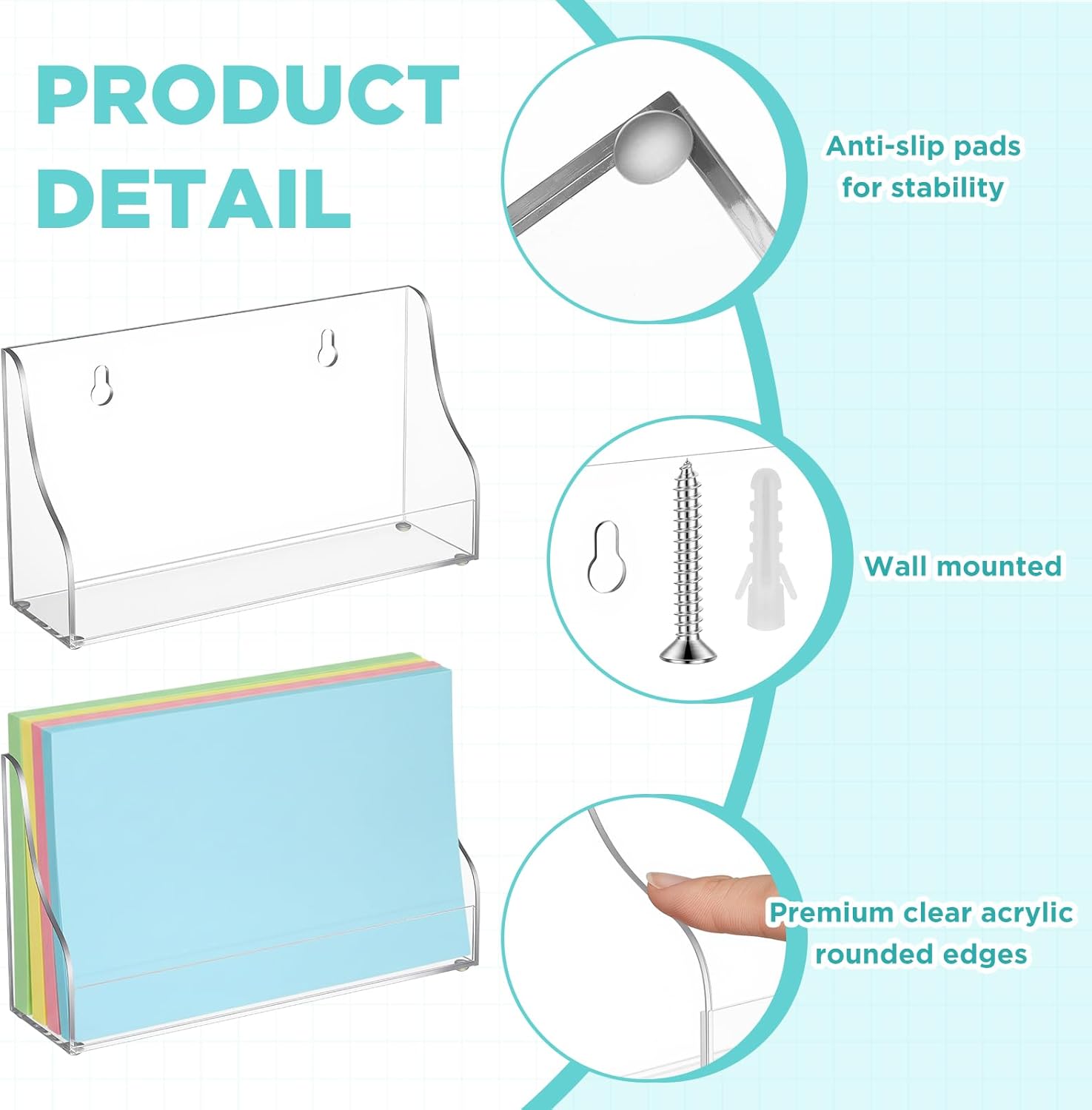 Features: Engineered with two grommet holes for secure wall mounting, this index card holder organizer can be installed to save valuable desk space. For times when a desktop solution is needed, it stands firmly on any flat surface. This dual-function design makes it suitable for dynamic environments like retail counters or classrooms, allowing information to be displayed where it is most visible and accessible. Beyond standard 5x8 index cards, this holder is perfectly sized for displaying postcards, small flyers, and cue cards. Its ability to keep different types of flat materials organized and visible makes it a versatile organizational tool. It helps reduce clutter by providing a dedicated space for the small but important papers used in daily work or study. Specifications: Material: acrylic Color: clear Size: 5 x 8 inch Package includes: 4 x Acrylic index card holder Notes: Manual measurement, please allow slight errors on size. The color may exist a slight difference due to different screen displays