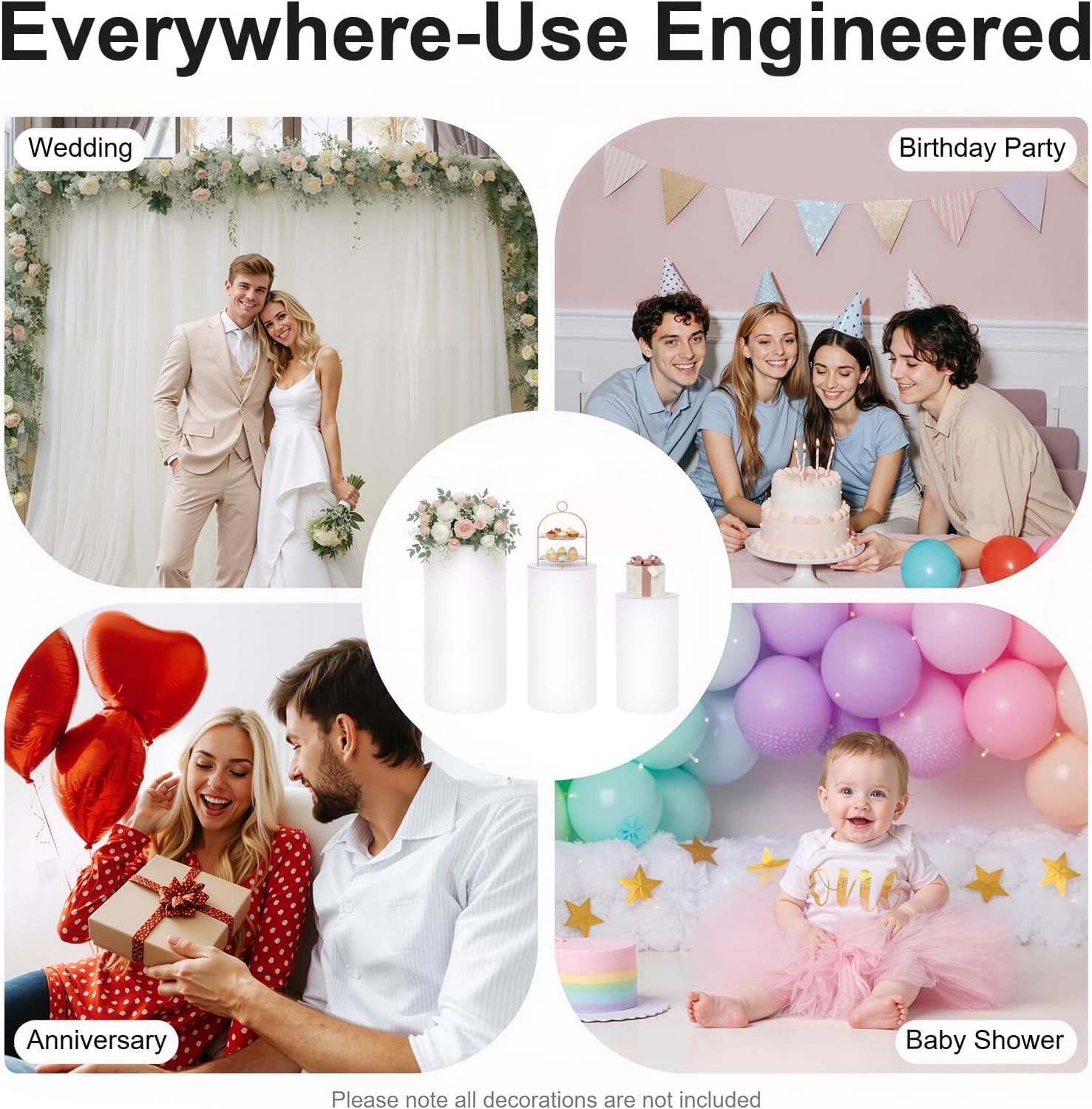 ApplicationIt can be used for weddings, birthday parties, Christmas parties, banquets, anniversary celebrations, school opening ceremonies, candy buffets, dessert tables, bachelor parties, store openings, graduation parties, and other special events.Specification Material: PVC(0.8mm/0.03in Thick Barrel Body; 5mm/0.2in Thick Lid), Acrylic (5mm/0.2in Thick Bottom Ring)Color: WhiteStyle: ModernAssembly Required: YesMounting Type: Free StandingNumber of Pieces: 3Load-bearing Capacity: 29kg/63.93 lbs(Large); 26kg/ 57.32 lbs(Middle); 22kg/48.5 lbs(Small)Product Size(D*H): 33*60cm/12.99*23.6in(Small); 36*75cm/14.17*29.5in(Middle); 40*90cm/15.75*35.4in(Large)Package Size: 94*15.5*55.5cm/37*6.1*21.85inGross Weight: 5.4kg/ 11.9lbsNet Weight: 4kg/8.81 lbsPackage Included3* Cylinder Pedestal Stands