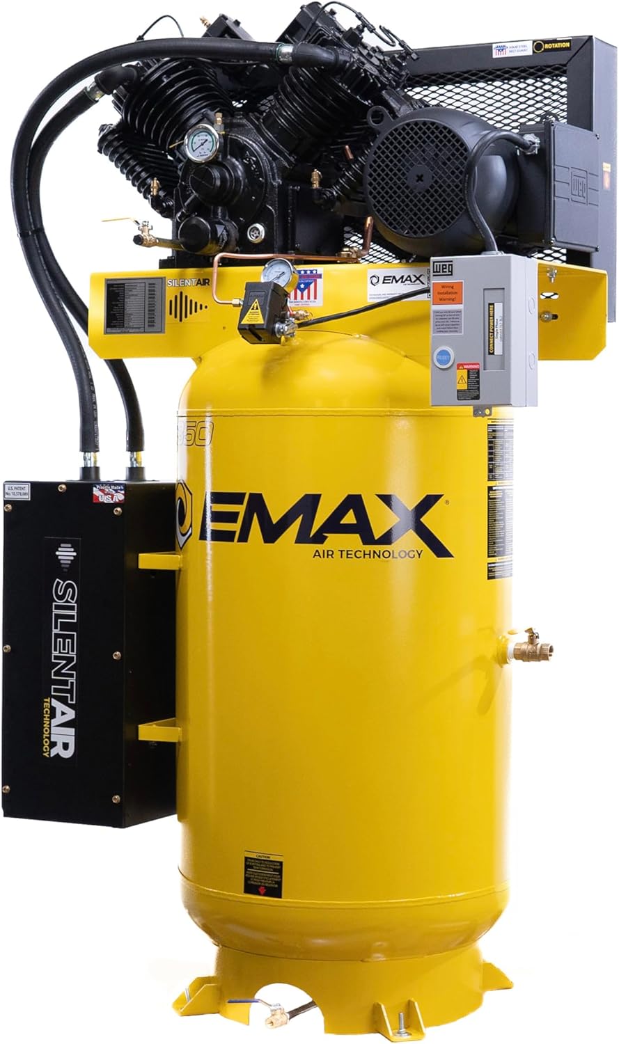 The Emax industrial plus 7.5 HP Large Vertical air compressor with silencer features a 2-Stage, piston-series cast iron pump with dual-control design allows for automatic or continuous run rated at up to 50, 000 hours based on B-10 bearing life rating. The cool-teak feature ensures that these are the coolest-running compressors in the industry (with 35 % lower operating temperature which reduces moisture build-up and extends pump life.) the ram-teak solid steel, heavy-gauge rods are built for maximum performance and durability, while the flow-teak concentric disc valves deliver maximum performance and longevity. Other features include a solid cast iron crankcase with oil sight glass, A belt tension adjuster that has fast, easy, one-turn way to tighten belts which reduces vibration and extends belt life, Built-in head unloaders, premium "non-absorbent" Gaskets to prevent oil seepage from pump, top quality compression and oil rings and more! This system truly delivers big air with little noise! This 1-phase, 80-Gallon air compressor offers super-quiet low RPM; It dissipates compressor intake noise by channeling the intake air through a series of baffle plates and pre-filter media Within the silencer cabinet. As a result, the piston intake noise is trapped and dissipated within the silencer structure. This compressor comes in the iconic Amax Yellow color and includes a three-year warranty. EMAX combines more than 38 years of experience With the latest technologies to deliver the highest-quality compressors. EMAX Compressor tools and equipment delivers overwhelming performance to ensure they meet the needs of even the most demanding environments. All products are designed with exacting tolerance and specifications to deliver all the power that is needed at the jobsite, garage or the shop for extreme performance.