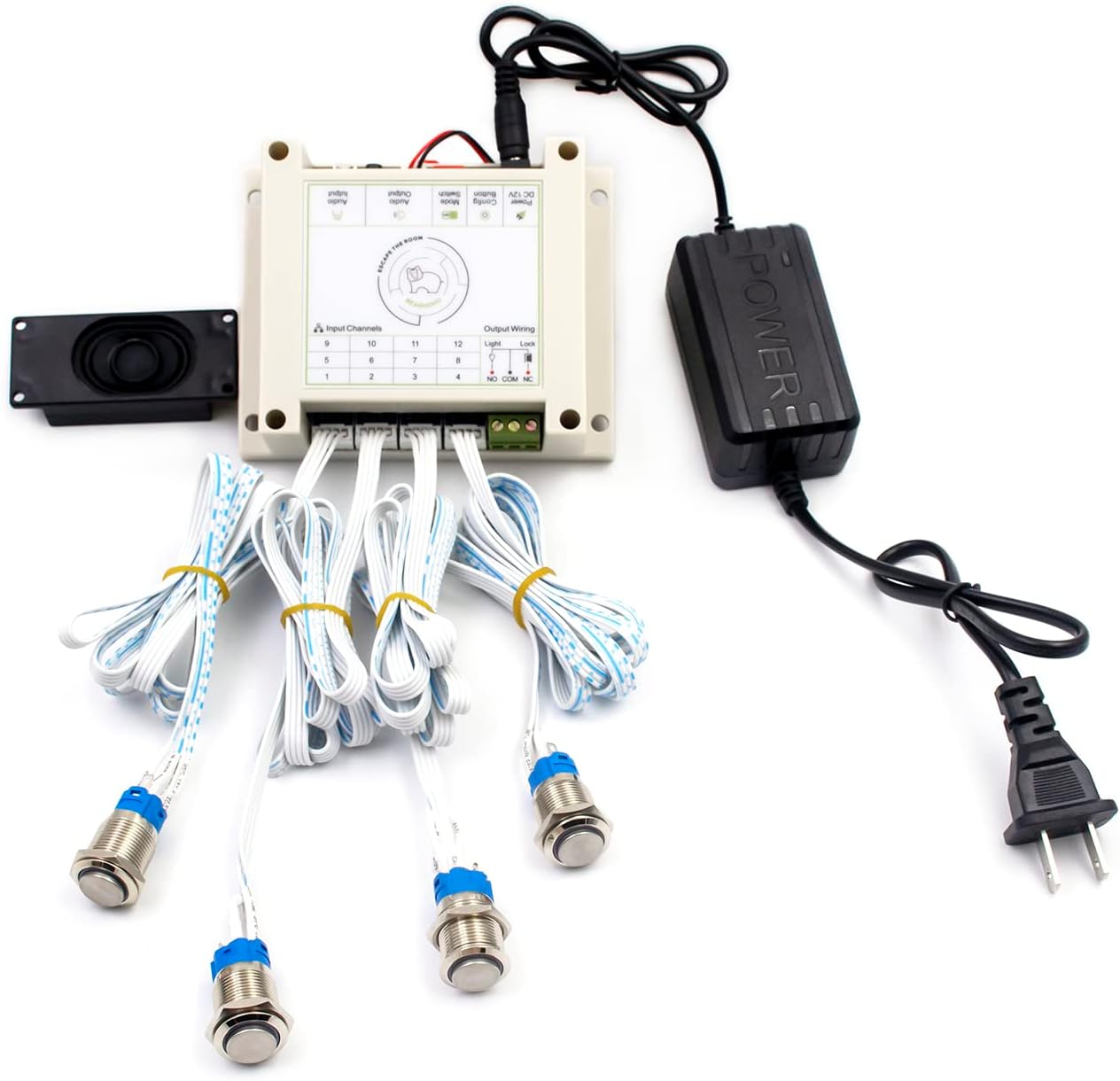 There is a controller connected with four metal buttons with audio. Room escape owners need to make some puzzle first, when adventures press these buttons in sequence or in the same time, the lock will release. Low working power, and easy to operate. PACKING LIST 1 x Controller (with or without Speaker) 4 x Metal Buttons (Color Lights) 1 x 12V Power Adapter 1 x USB Cable 1 x User Manual Tips: Props do NOT include electromagnetic locks, please provide your own. PLAYING MODE There are 2 kinds of playing modes in these props: Simultaneous mode and Sequence mode, it is easy to switch the playing modes by the settings switch. Step 1: There are 4 metal buttons could be found in the escape room. Step 2: Player need to press the metal buttons at one certain point of time(Simultaneous Mode) or one by one in the correct order (Sequence Mode), then the props will be triggered and the door lock will be opened. HOW TO RESET There are 3 ways to reset the props. Automatically reset mode: Waiting for 1 minute to automatically reset after successful trigger (There will be a buzzing sound when it reset). Real Time reset mode Sequence mode- After triggering successfully, press the metal buttons in the correct order again to reset. Simultaneous mode- Press the metal buttons in a certain time again to reset. Manual reset: Restart the controller to reset. MODIFY THE VOICE FILES 1. Insert the USB cable to the controller, and connect the controller to your PC. 2. Open the removable disk shows in the PC, backup all the original files in the controller. 3. Replace the original file with your favorite sound file, the path and the file name cannot be changed, the audio file format must be in MP3 format. 4. If you want to format the removable disk, please format it to FAT format only. Please do not format it to FAT32, exFAT or NTFS format.