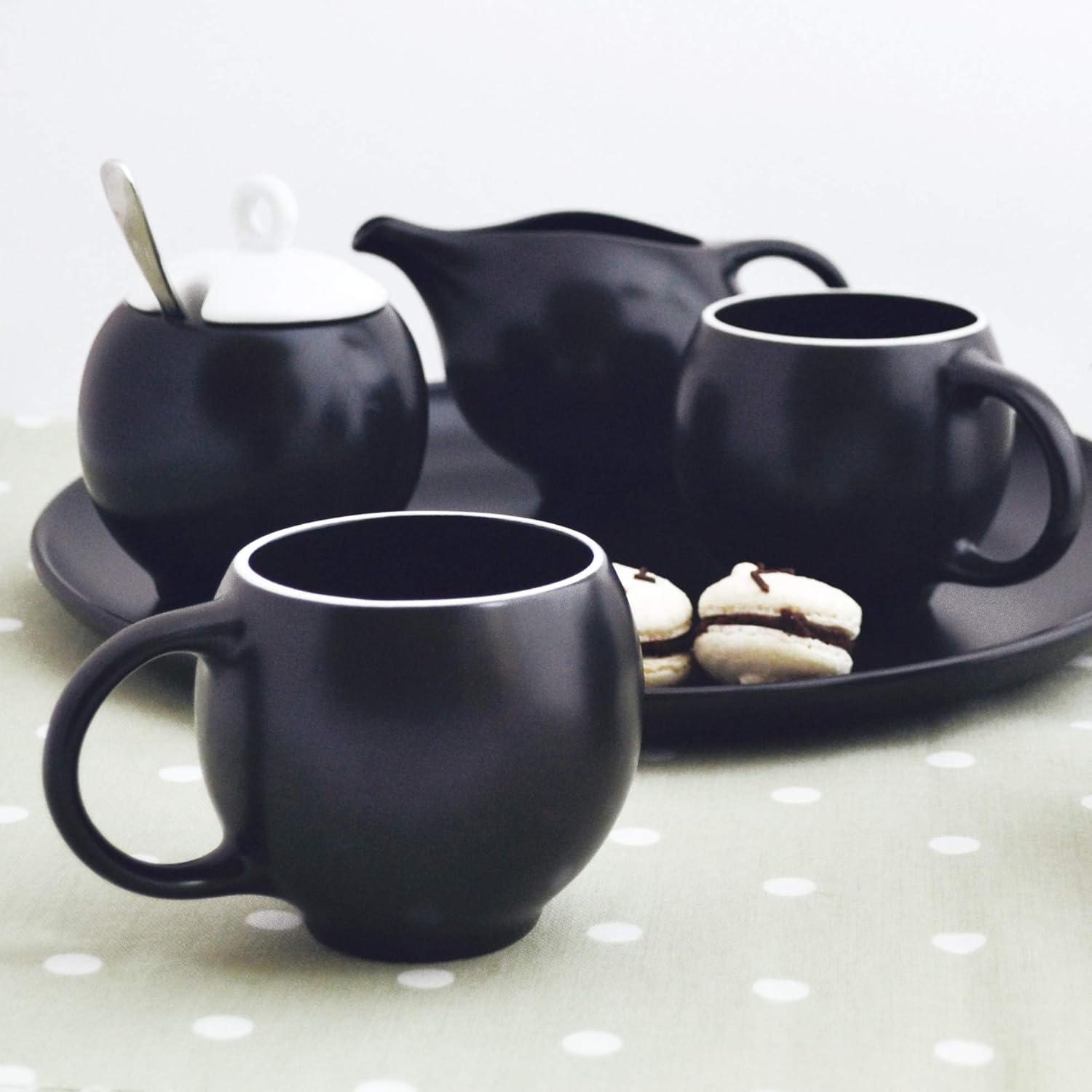 Inspired by the ceramics of Eva Zeisel, the EVA teaset embodies her design philosophy of attracting the hand as well as the eye. Simple, elegant and delightful to handle, the Eva teaset won the 2014 Golden A’ Design Award for Tableware. Available in a black matte stoneware with white lids. The pitcher pours perfectly and can also be used for sauces. The bowl can be used with grains or cubes of sugar. milk pitcher: 15 x 9 x 9 cm. (200 ml.) sugar bowl: 9 x 9 x 11 cm. (200 ml.) (Also available in glossy white porcelain with a silver plate ring on sugar bowl lid.)