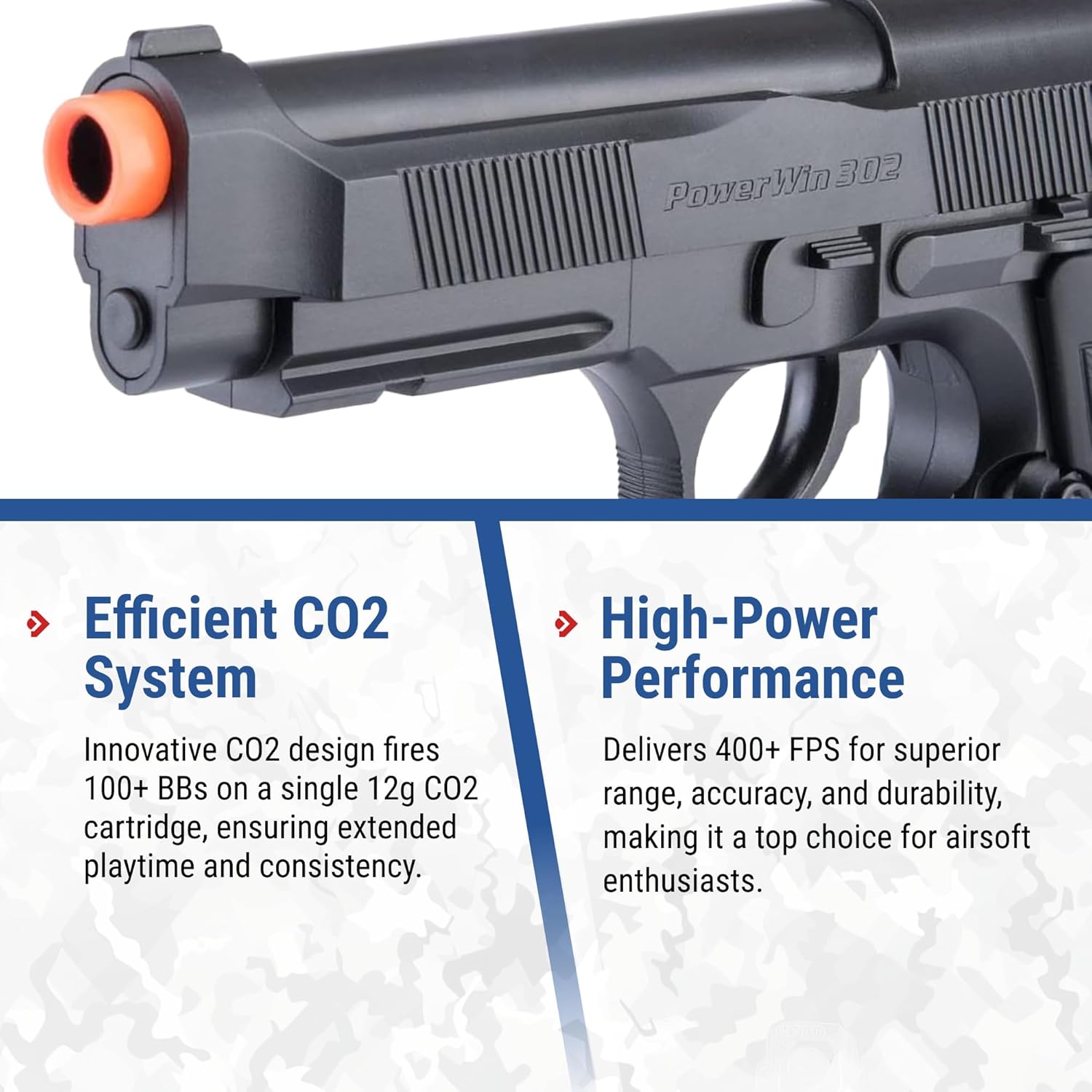 The Win Gun CO2 pistol features sliding handle panel to conceal the CO2 locking base, functional safety, heavy weight inserts and high power. The highly efficient CO2 system can fire over 100 BB's on one CO2 cartridge. Don't be fooled by it's price, this pistol shoots whopping close to 500 FPS with 0.20g bb! For those looking for an affordable high power non-blowback, this handgun does it all with a awesome 400+ FPS for a very small price tag! Dimension: 8.5" Long x 5.25" Tall Weight: 539g Gas: 12 gram CO2 cartridges. Size / BB: 6mm Airsoft bb. 0.25g or heavier / Matrix & Compatible high grade bbs recommended for best performance, accuracy and range. Mode: Semi-Automatic / Safety Action:Non-Blowback / Semi-Automatic. Hopup: Yes. Muzzle Velocity: 370~499 FPS. Measured with 0.20g bb. Package Includes: Gas Airsoft Pistol, Mag, Manual Mag Capacity: 15 +/- Rounds. Disclaimer: This hand gun fires over 400 FPS and may not be applicable for fields with FPS limit under 400 FPS