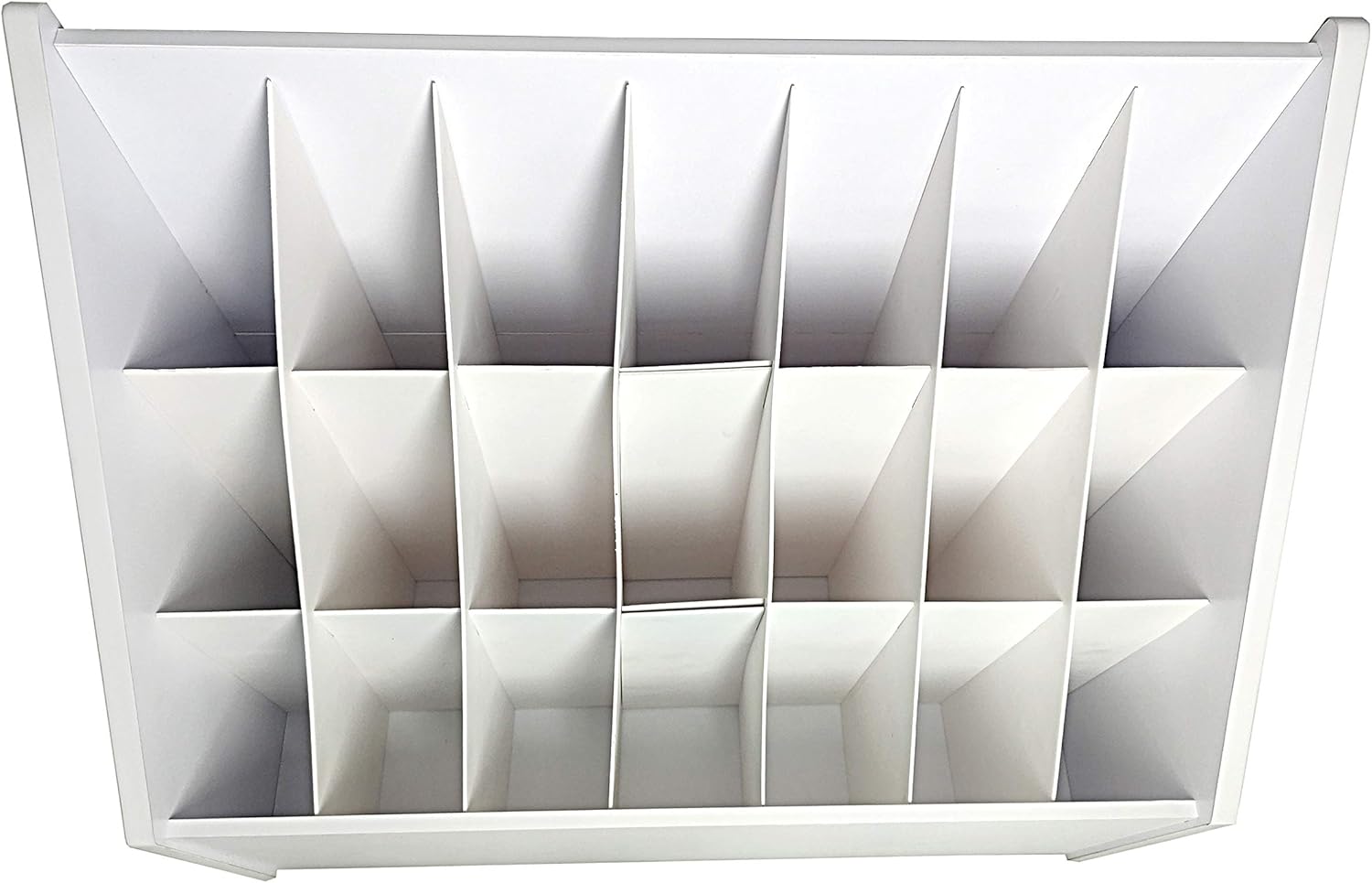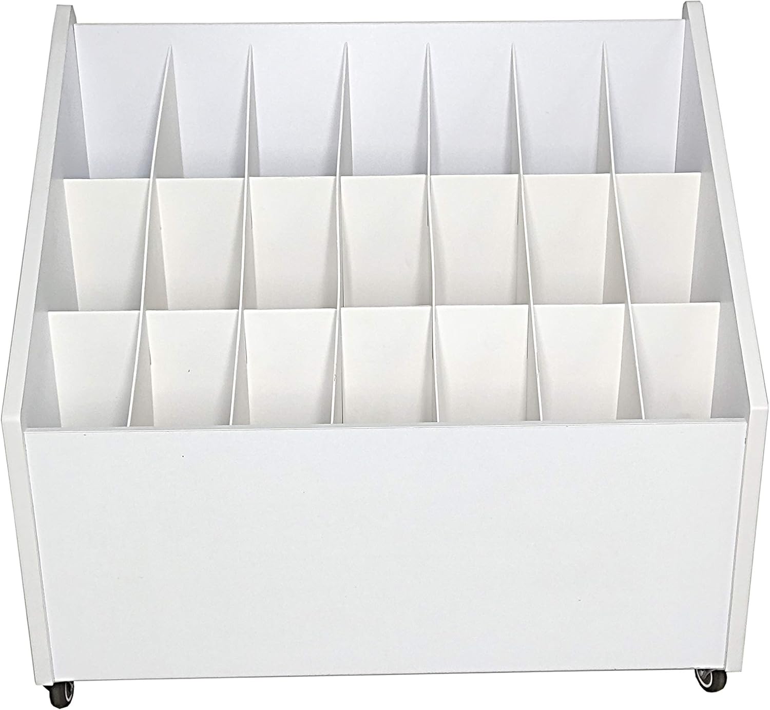 The Engineering Drawing Blueprint Organizer Movable Mobile Rolling Cart is designed to efficiently store and organize rolled-up art, prints, plans, or backdrops, accommodating items up to 8 feet tall. It measures 30-1/4"W x 15-3/4"D x 29-1/4"H with a front panel height of 12", weighing 38 lbs, providing a sturdy and compact storage solution. Featuring 21 compartments with removable dividers, each compartment is sized at 4" x 4.7", capable of accommodating rolled documents up to 3.9" in diameter. The organizer incorporates durable expanded PVC inserts/dividers, ensuring safety with non-sharp edges and facilitating efficient organization without compromising durability. Equipped with 2" swivel casters, this mobile rolling file system allows easy maneuverability across offices or shops, offering a versatile and convenient storage option.